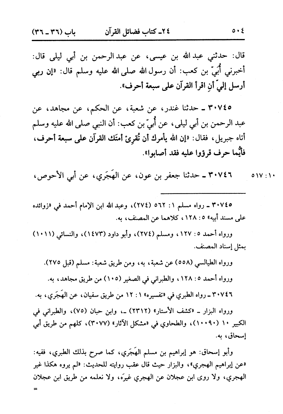 30745- حَدَّثَنَا غُنْدَر ، عَنْ شُعْبَة ، عَنِ الحَكْم ، عَنْ مُجَاهِدْ ، عَنْ عَبْدِ الرَّحْمَنِ بْنِ أَبِي لَيْلَى ، عَنْ أُبَيِّ بْنِ كَعْبٍ ، أَنَّ النَّبِيَّ اللهِ صَلَّى الله عَلَيْهِ وَسَلَّمَ أَتَاهُ جِبْرِيلُ فَقَالَ : إنَّ اللَّهَ يَأْمُرُك أَنْ تُقْرِئَ أُمَّتُك الْقُرْآنَ عَلَى سَبْعَةِ أَحْرُفٍ فَأَيُّمَا حَرْفٍ قَرَؤُوا عَلَيْهِ ، فَقَدْ أَصَابُوا. (10/516).