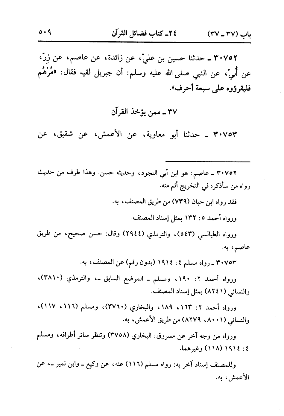 30752- حَدَّثَنَا حُسَيْنُ بْنُ عَلِيٍّ ، عَنْ زَائِدَةَ ، عَنْ عَاصِمٍ ، عَنْ زِرٍّ ، عَنْ أُبَيٍّ ، عَنِ النَّبِيِّ صَلَّى الله عَلَيْهِ وَسَلَّمَ : أنَّ جِبْرِيلَ لقيه فَقَالَ : مُرْهُمْ فَلْيَقْرَؤُوهُ عَلَى سَبْعَةِ أَحْرُفٍ.