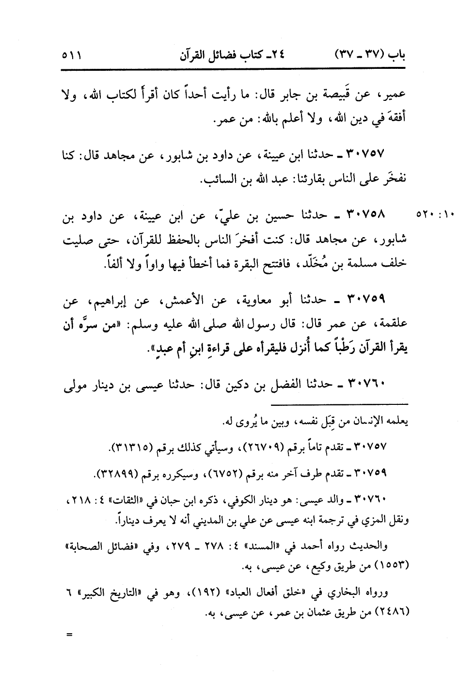30759- حَدَّثَنَا أَبُو مُعَاوِيَةَ ، عَنِ الأَعْمَشِ ، عَنْ إِبْرَاهِيمَ ، عَنْ عَلْقَمَةَ ، عَنْ عَمْرٍو ، قَالَ : قَالَ رَسُولُ اللهِ صَلَّى الله عَلَيْهِ وَسَلَّمَ : مَنْ سَرَّهُ أَنْ يَقْرَأَ الْقُرْآنَ رَطْبًا كَمَا أُنْزِلَ فَلْيَقْرَأْ عَلَى قِرَاءَةِ ابْنِ أُمِّ عَبْدٍ. (10/520).