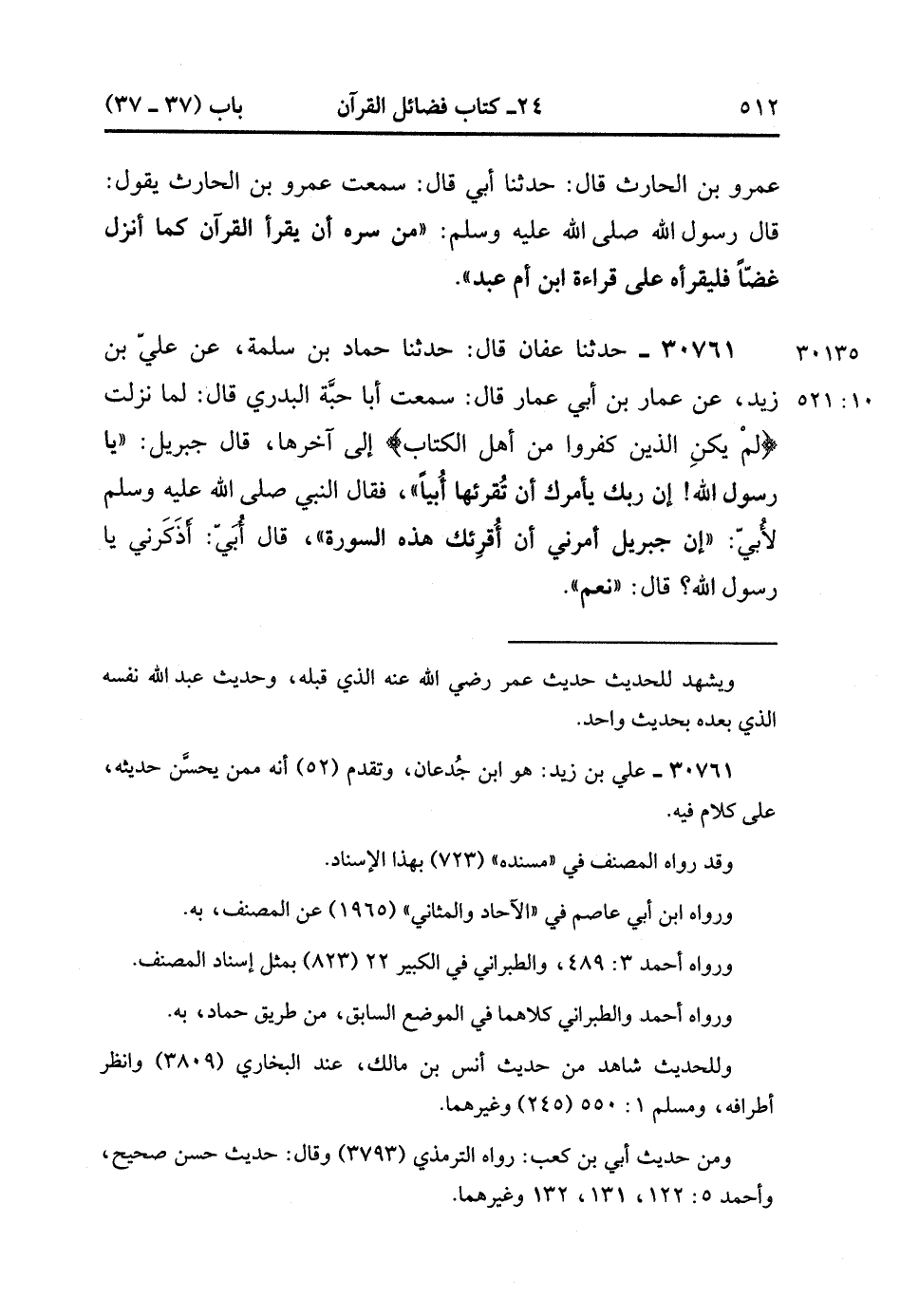 30761- حَدَّثَنَا عَفَّانُ , قَالَ : حدَّثَنَا حَمَّادُ بْنُ سَلَمَةَ ، عَنْ عَلِيِّ بْنِ زَيْدٍ ، عَنْ عَمَّارِ بْنِ أَبِي عَمَّارٍ ، قَالَ : سَمِعْتُ أَبَا حَبَّةَ الْبَدْرِيَّ قَالَ : لَمَّا نَزَلَتْ : {لَمْ يَكُنِ الَّذِينَ كَفَرُوا مِنْ أَهْلِ الْكِتَابِ} إِلَى آخِرِهَا ، قَالَ جِبْرِيلُ : يَا رَسُولَ اللهِ ، إنَّ رَبَّك يَأْمُرُك أَنْ تُقْرِئَهَا أُبَيًّا ، فَقَالَ النَّبِيُّ صَلَّى الله عَلَيْهِ وَسَلَّمَ لأُبَيٍّ : إنَّ جِبْرِيلَ أَمَرَنِي أَنْ أُقْرِئَك هَذِهِ السُّورَةَ ، قَالَ أُبَيٌّ : أَذَكَرَنِي يَا رَسُولَ اللهِ ؟ قَالَ : نَعَمْ. (10/520).