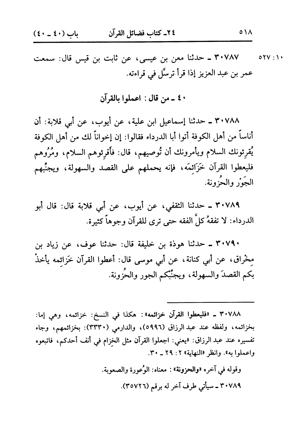 30788- حَدَّثَنَا إسْمَاعِيلُ ابْنُ عُلَيَّةَ ، عَنْ أَيُّوبَ ، عَنْ أَبِي قِلابَةَ ، أَنَّ أُنَاسًا مِنْ أَهْلِ الْكُوفَةِ أتوا أبَا الدَّرْدَاءِ , فَقَالُوا : إنَّ إخْوَانًا لك مِنْ أَهْلِ الْكُوفَةِ يُقْرِئُونَك السَّلامَ وَيَأْمُرُونَك أَنْ تُوصِيَهُمْ ، قَالَ : فَأَقْرِئُوهُمَ السَّلامَ وَمُرُوهُمْ فَلْيُعْطُوا الْقُرْآنَ خَزَائِمَهُ ، فَإِنَّهُ يَحْمِلُهُمْ عَلَى الْقَصْدِ وَالسُّهُولَةِ ، وَيُجَنِّبُهُمَ الْجَوْرَ وَالْحُزُونَةَ.
