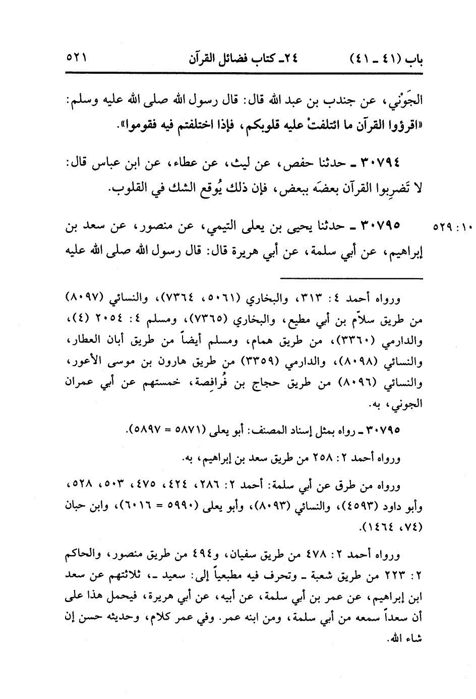 30795- حَدَّثَنَا يَحْيَى بْنُ يَعْلَى التَّيْمِيُّ ، عَنْ مَنْصُورٍ ، عَنْ سَعْدِ بْنِ إِبْرَاهِيمَ ، عَنْ أَبِي سَلَمَةَ ، عَنْ أَبِي هُرَيْرَةَ ، قَالَ : قَالَ رَسُولُ اللهِ صَلَّى الله عَلَيْهِ وَسَلَّمَ : جِدَالٌ فِي الْقُرْآنِ كُفْرٌ. (10/529).