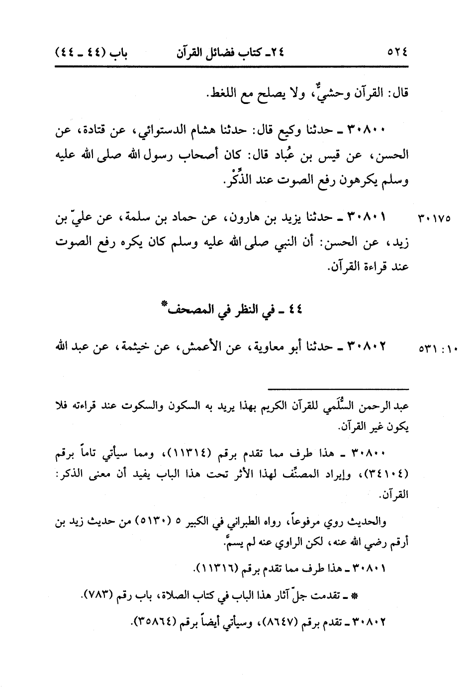 30802- حَدَّثَنَا أَبُو مُعَاوِيَةَ ، عَنِ الأَعْمَشِ ، عَنْ خَيْثَمَةَ ، عَنْ عَبْدِ اللهِ بْنِ عَمْرٍو ، قَالَ : انْتَهَيْت إلَيْهِ وَهُوَ يَنْظُرُ فِي الْمُصْحَفِ ، قَالَ : قُلْتُ : أَيُّ شَيْءٍ تَقْرَأُ فِي الْمُصْحَفِ ؟ قَالَ : حِزْبِي الَّذِي أَقُومُ بِهِ اللَّيْلَةَ. (10/530).