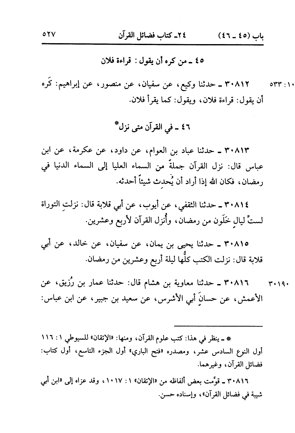 30815- حَدَّثَنَا يَحْيَى بْنُ يَمَانٍ ، عَنْ سُفْيَانَ ، عَنْ خَالِدٍ ، عَنْ أَبِي قِلابَةَ ، قَالَ : نَزَلَتِ الْكُتُبُ كلها لَيْلَةَ أَرْبَعٍ وَعِشْرِينَ مِنْ رَمَضَانَ.
