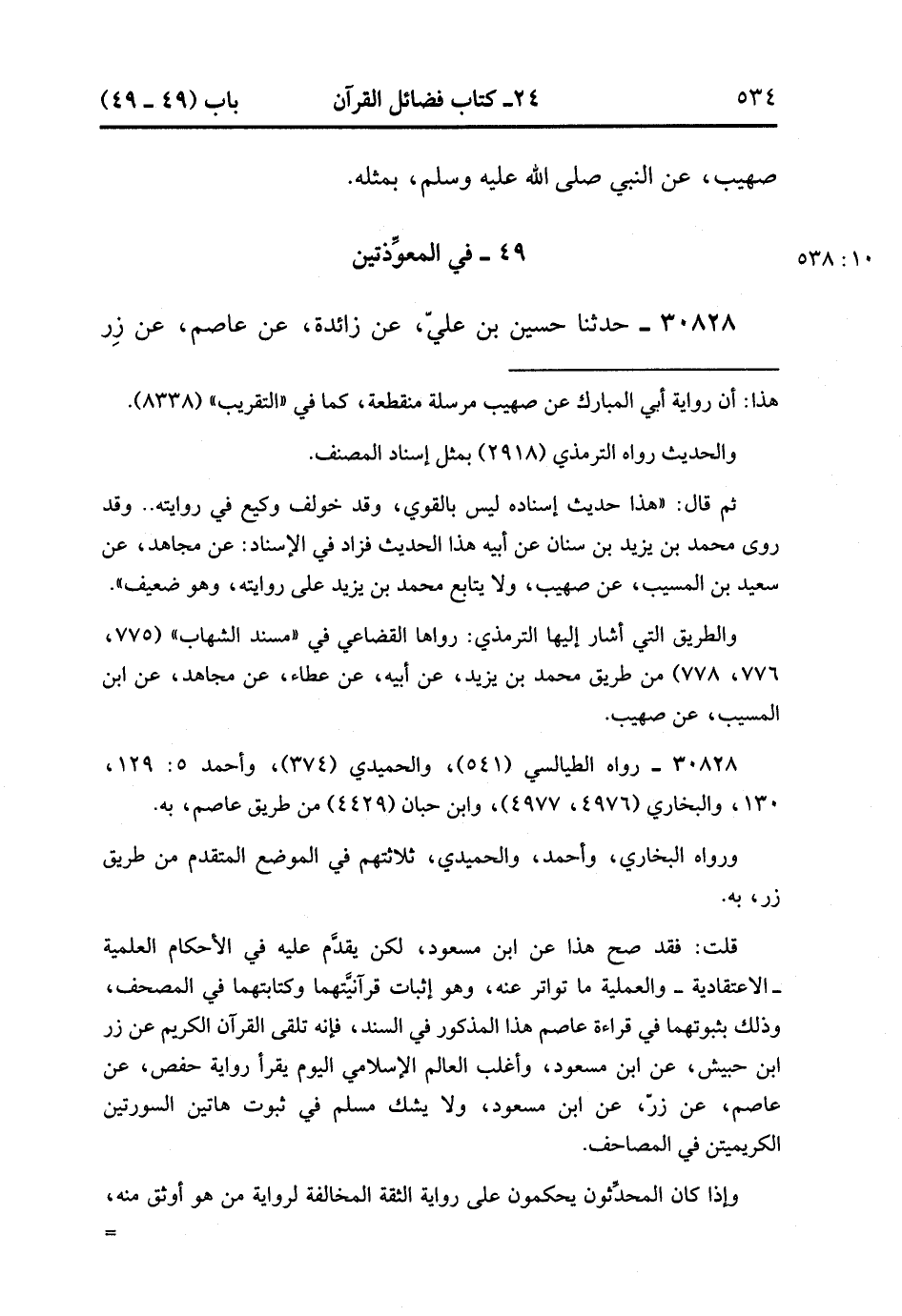 30828- حَدَّثَنَا حُسَيْنُ بْنُ عَلِيٍّ ، عَنْ زَائِدَةَ ، عَنْ عَاصِمٍ ، عَنْ زِرٍّ ، قَالَ : قُلْتُ لأُبَيٍّ : إنَّ ابْنَ مَسْعُودٍ لاَ يَكْتُبُ الْمُعَوِّذَتَيْنِ فِي مُصْحَفِهِ ، فَقَالَ : إنِّي سَأَلْت عَنْهُمَا النَّبِيُّ صَلَّى الله عَلَيْهِ وَسَلَّمَ فَقَالَ : قِيلَ لِي ، فَقُلْتُ : فَقَالَ : أُبَيٌّ : وَنَحْنُ نَقُولُ كَمَا قِيلَ لَنَا. (10/538).