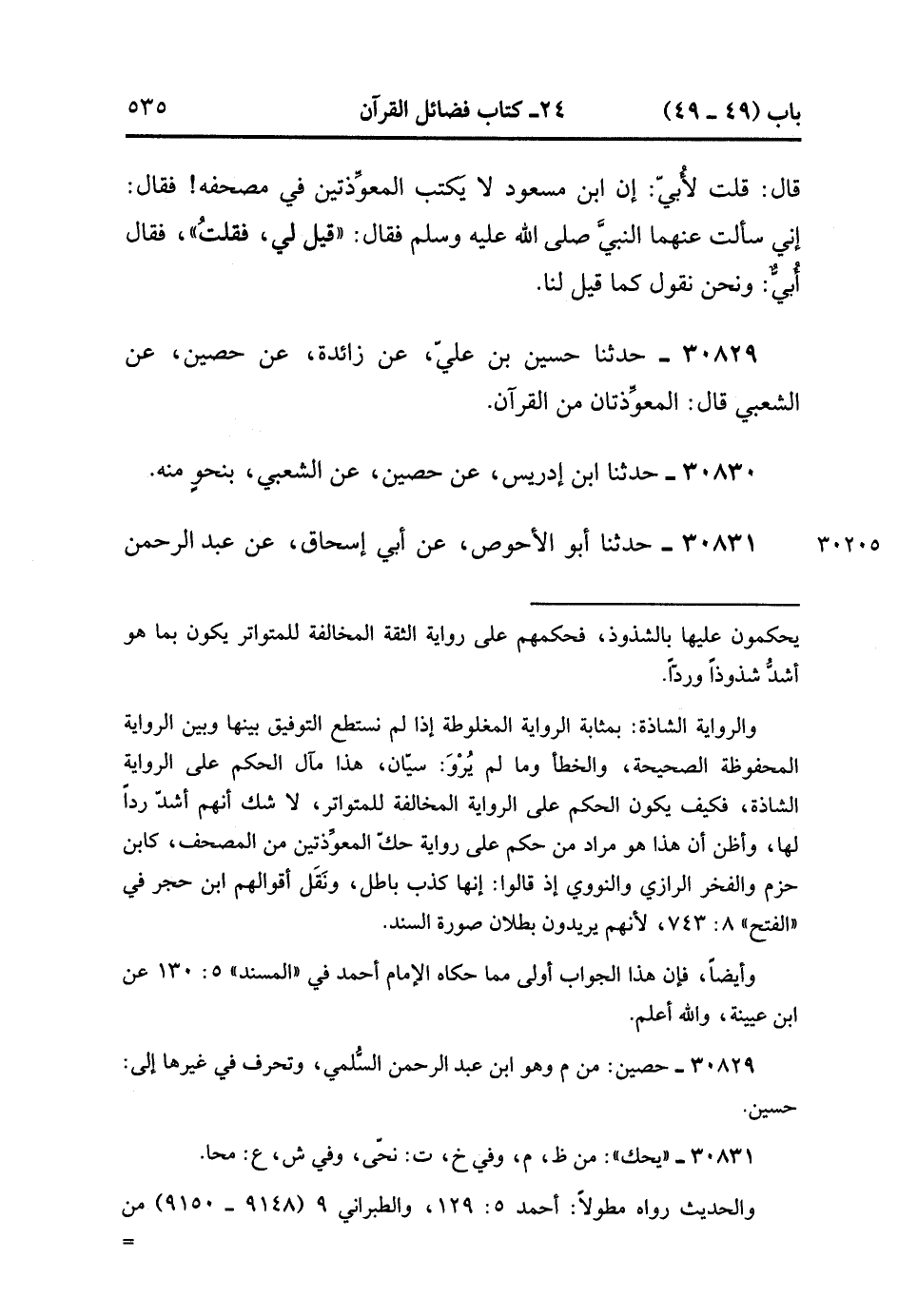 30831- حَدَّثَنَا أَبُو الأَحْوَصِِ ، عَنْ أَبِي إِسْحَاقَ ، عَنْ عَبْدِ الرَّحْمَنِ بْنِ يَزِيدَ ، قَالَ : رَأَيْتُ عَبْدَ اللهِ يَحك الْمُعَوِّذَتَيْنِ مِنْ مَصَاحِفِهِ ، وقال : لاَ تَخْلِطُوا فِيهِ مَا لَيْسَ مِنْهُ. (10/538).