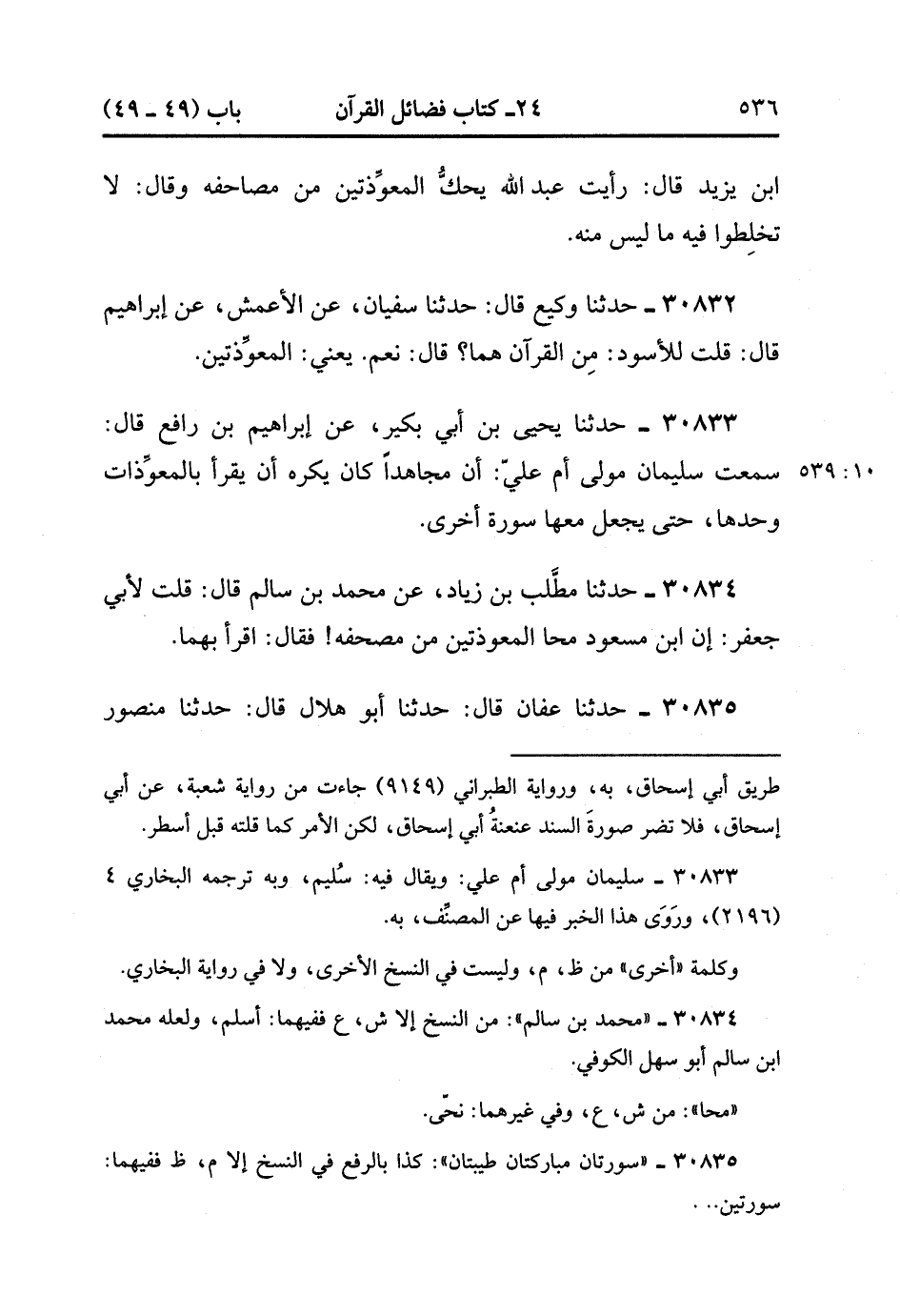 30834- حَدَّثَنَا مُطَّلِبُ بْنُ زِيَادٍ ، عَنْ مُحَمَّدِ بْنِ سَالِمٍ ، قَالَ : قُلْتُ لأَبِي جَعْفَرٍ : إنَّ ابْنَ مَسْعُودٍ مَحَا الْمُعَوِّذَتَيْنِ مِنْ مُصْحَفِهِ ، فَقَالَ : اقْرَأْ بِهِمَا.