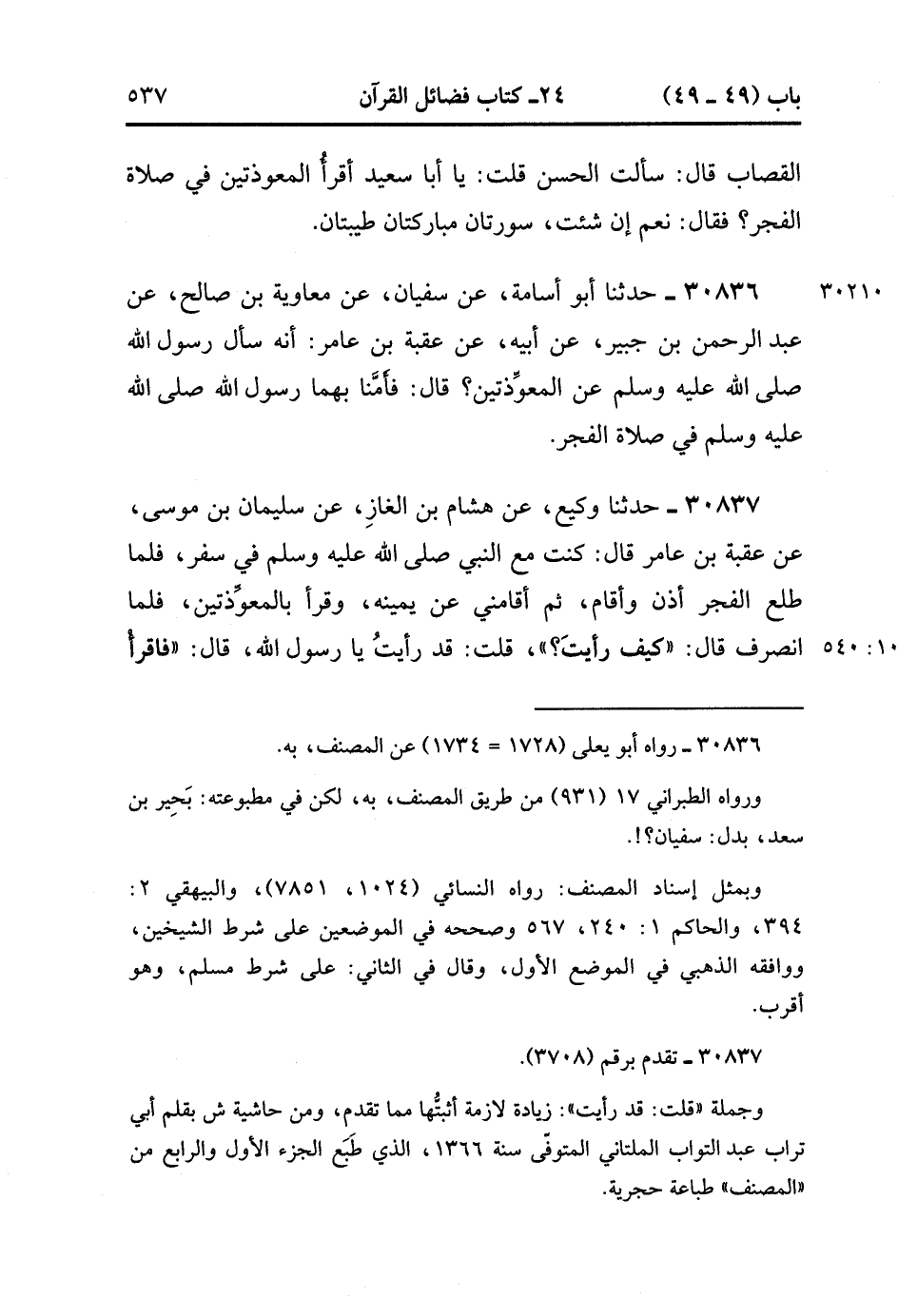 30837- حَدَّثَنَا وَكِيعٌ ، عَنْ هِشَامِ بْنِ الْغَازِ ، عَنْ سُلَيْمَانَ بْنِ مُوسَى ، عَنْ عُقْبَةَ بْنِ عَامِرٍ ، قَالَ : كُنْتُ مَعَ النَّبِيِّ صَلَّى الله عَلَيْهِ وَسَلَّمَ فِي سَفَرٍ ، فَلَمَّا طَلَعَ الْفَجْرُ أَذَّنَ وَأَقَامَ ، ثُمَّ أَقَامَنِي عَنْ يَمِينِهِ وَقَرَأَ بِالْمُعَوِّذَتَيْنِ فَلَمَّا انْصَرَفَ ، قَالَ : كَيْفَ رَأَيْت ؟ قُلْتُ : قَدْ رَأَيْت يَا رَسُولَ اللهِ ، قَالَ : فَاقْرَأْ بِهِمَا كُلَّمَا نِمْت وَكُلَّمَا قُمْت. (10/539).