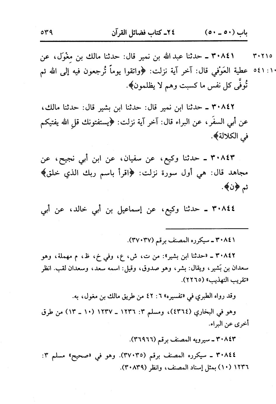 30841- حَدَّثَنَا عَبْدُ اللهِ بْنُ نُمَيْرٍ , قَالَ : حدَّثَنَا مَالِكُ بْنُ مِغْوَلٍ ، عَنْ عَطِيَّةَ الْعَوْفِيِّ ، قَالَ : آخِرُ آيَةٍ نَزَلَتْ : {وَاتَّقُوا يَوْمًا تُرْجَعُونَ فِيهِ إِلَى اللهِ ثُمَّ تُوَفَّى كُلُّ نَفْسٍ مَا كَسَبَتْ وَهُمْ لاَ يُظْلَمُونَ}.