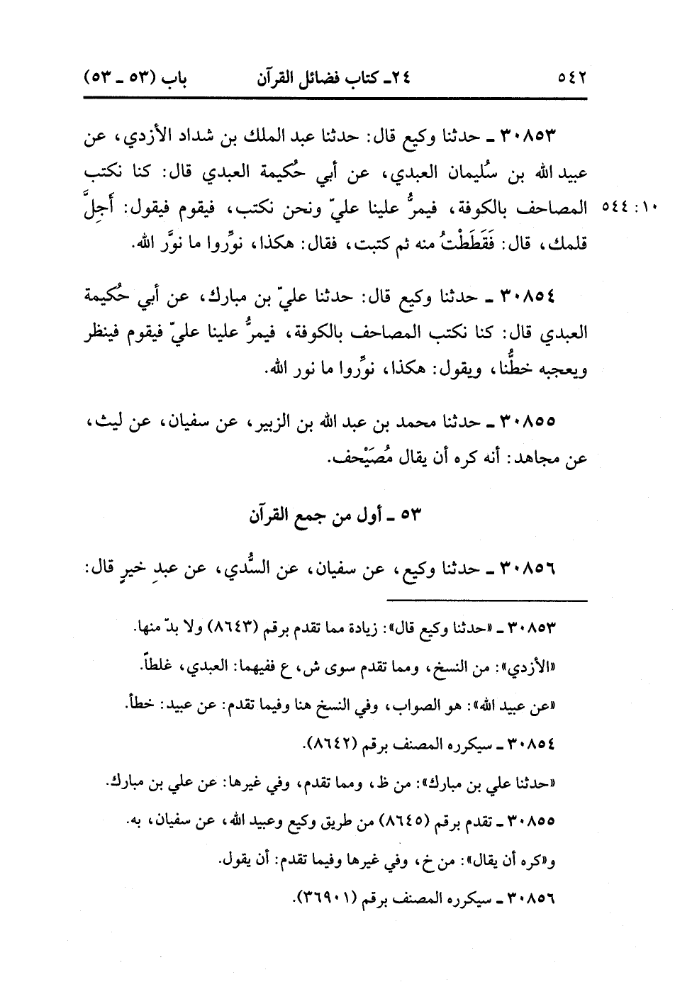 30853- حَدَّثَنَا وَكِيعٌ , قَالَ : حدَّثَنَا عَبْدُ الْمَلِكَ بْنُ شَدَّادٍ الأَزْدِيُّ ، عَنْ عُبَيْدِ الله بْنِ سُلَيْمَانَ الْعَبْدِيِّ ، عَنْ أَبِي حَكِيمَةَ الْعَبْدِيِّ ، قَالَ : كُنَّا نَكْتُبُ الْمَصَاحِفَ بِالْكُوفَةِ فَيَمُرُّ عَلَيْنَا عَلِيٌّ وَنَحْنُ نَكْتُبُ فَيَقُومُ فَيَقُولُ : أَجِلَّ قَلَمَكَ ، قَالَ : فَقَطَطْت مِنْهُ ، ثُمَّ كَتَبْتُ ، فَقَالَ : هَكَذَا نَوِّرُوا مَا نَوَّرَ اللَّهُ. (10/543).