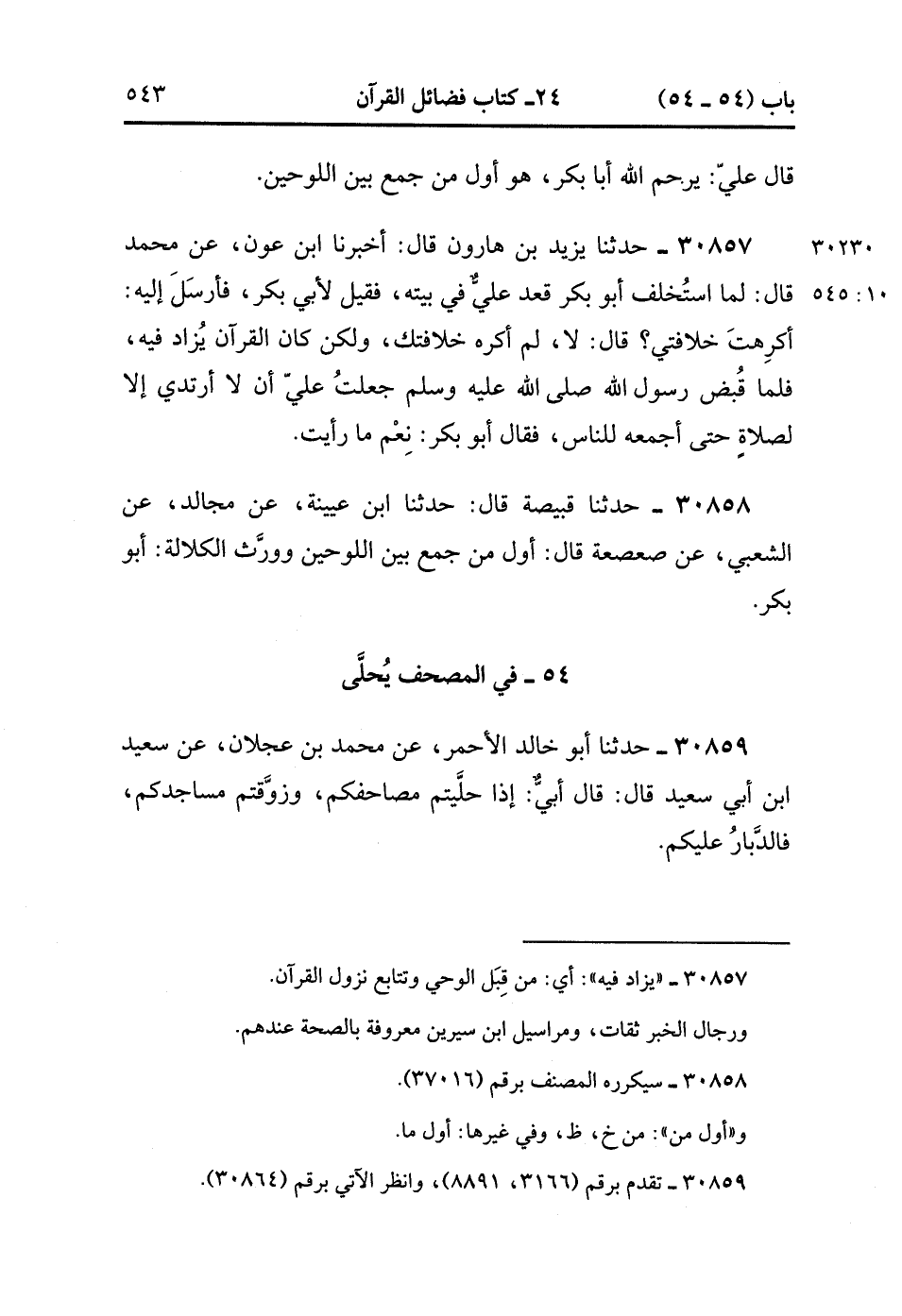 30857- حَدَّثَنَا يَزِيدُ بْنُ هَارُونَ , قَالَ : أَخْبَرَنَا ابْنُ عَوْنٍ ، عَنْ مُحَمَّدٍ ، قَالَ : لَمَّا اسْتُخْلِفَ أَبُو بَكْرٍ قَعَدَ عَلِيٌّ فِي بَيْتِهِ فَقِيلَ لأَبِي بَكْرٍ فَأَرْسَلِ إلَيْهِ : أَكَرِهْت خِلافَتِي ، قَالَ : لاَ ، لَمْ أَكْرَهْ خِلافَتَكَ ، وَلَكِنْ كَانَ الْقُرْآنُ يُزَادُ فِيهِ ، فَلَمَّا قُبِضَ رَسُولُ اللهِ صَلَّى الله عَلَيْهِ وَسَلَّمَ جَعَلْت عَلَيّ أَنْ لاَ أَرْتَدِيَ إِلاَّ لِصَلاةٍ حَتَّى أَجْمَعَهُ لِلنَّاسِ ، فَقَالَ أَبُو بَكْرٍ : نِعْمَ مَا رَأَيْت.