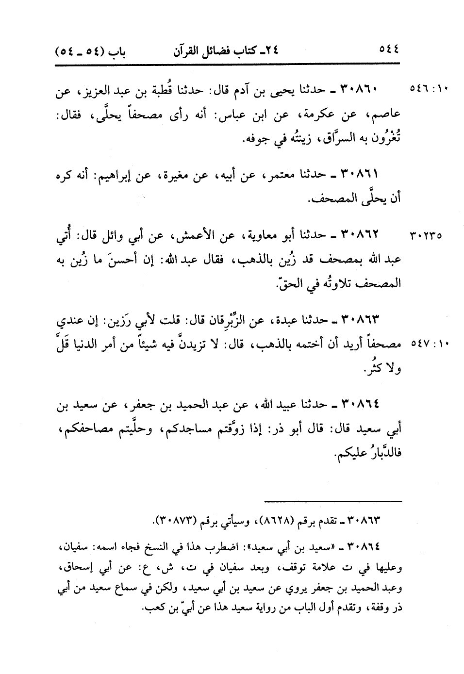 30863- حَدَّثَنَا عَبْدَةُ ، عَنِ الزِّبْرِقَانِ ، قَالَ : قُلْتُ لأَبِي رَزِينٍ : إنَّ عِنْدِي مُصْحَفًا أُرِيدُ أَنْ أَخْتِمَهُ بِالذَّهَبِ ، قَالَ : لاَ تَزِيدَنَّ فِيهِ شَيْئًا مِنْ أَمْرِ الدُّنْيَا قَلَّ ، وَلا كَثُرَ. (10/546).