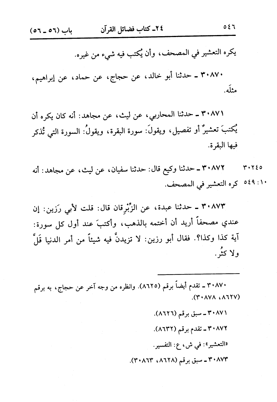30873- حَدَّثَنَا عَبْدَةُ ، عَنِ الزِّبْرِقَانِ ، قَالَ : قُلْتُ لأَبِي رَزِينٍ : إنَّ عِنْدِي مُصْحَفًا أُرِيدُ أَنْ أَخْتِمَهُ بِالذَّهَبِ ، وَأَكْتُبَ عِنْدَ أَوَّلِ سُورَةٍ آيَةُ كَذَا وَكَذَا ، فقَالَ أَبُو رَزِينٍ : لاَ تَزِيدَنَّ فِيهِ شَيْئًا مِنْ أَمْرِ الدُّنْيَا قَلَّ ، وَلا كَثُرَ. (10/549).
