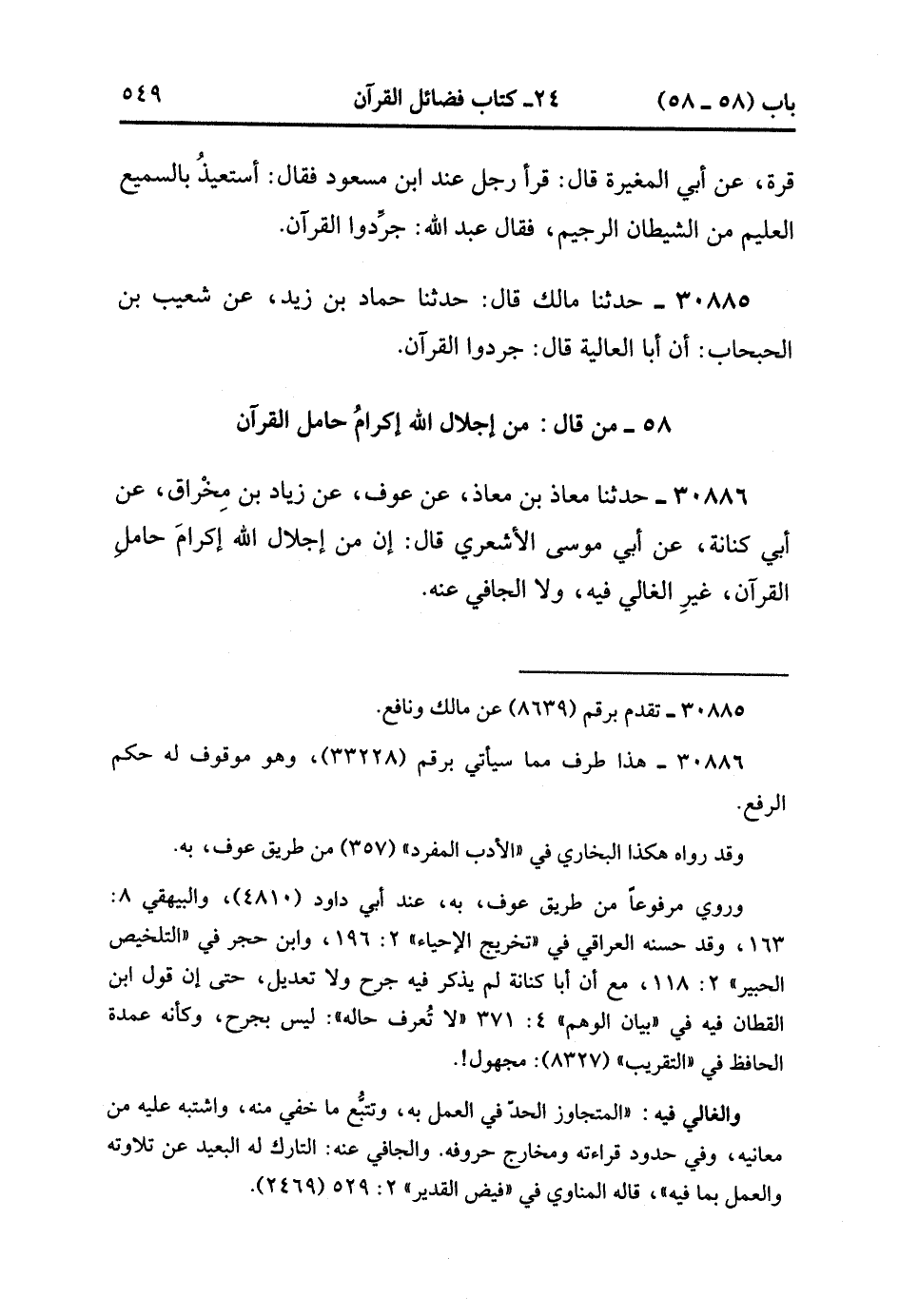 30886- حَدَّثَنَا مُعَاذُ بْنُ مُعَاذٍ ، عَنْ عَوْفٍ ، عَنْ زِيَادِ بْنِ مِخْرَاقٍ ، عَنْ أَبِي كِنَانَةَ ، عَنْ أَبِي مُوسَى الأَشْعَرِيِّ ، قَالَ : إِنَّ مِنْ إجْلالِ اللهِ إكْرَامُ حَامِلِ الْقُرْآنِ غَيْرِ الْغَالِي فِيهِ ، وَلا الْجَافِي عَنْهُ. (10/551).