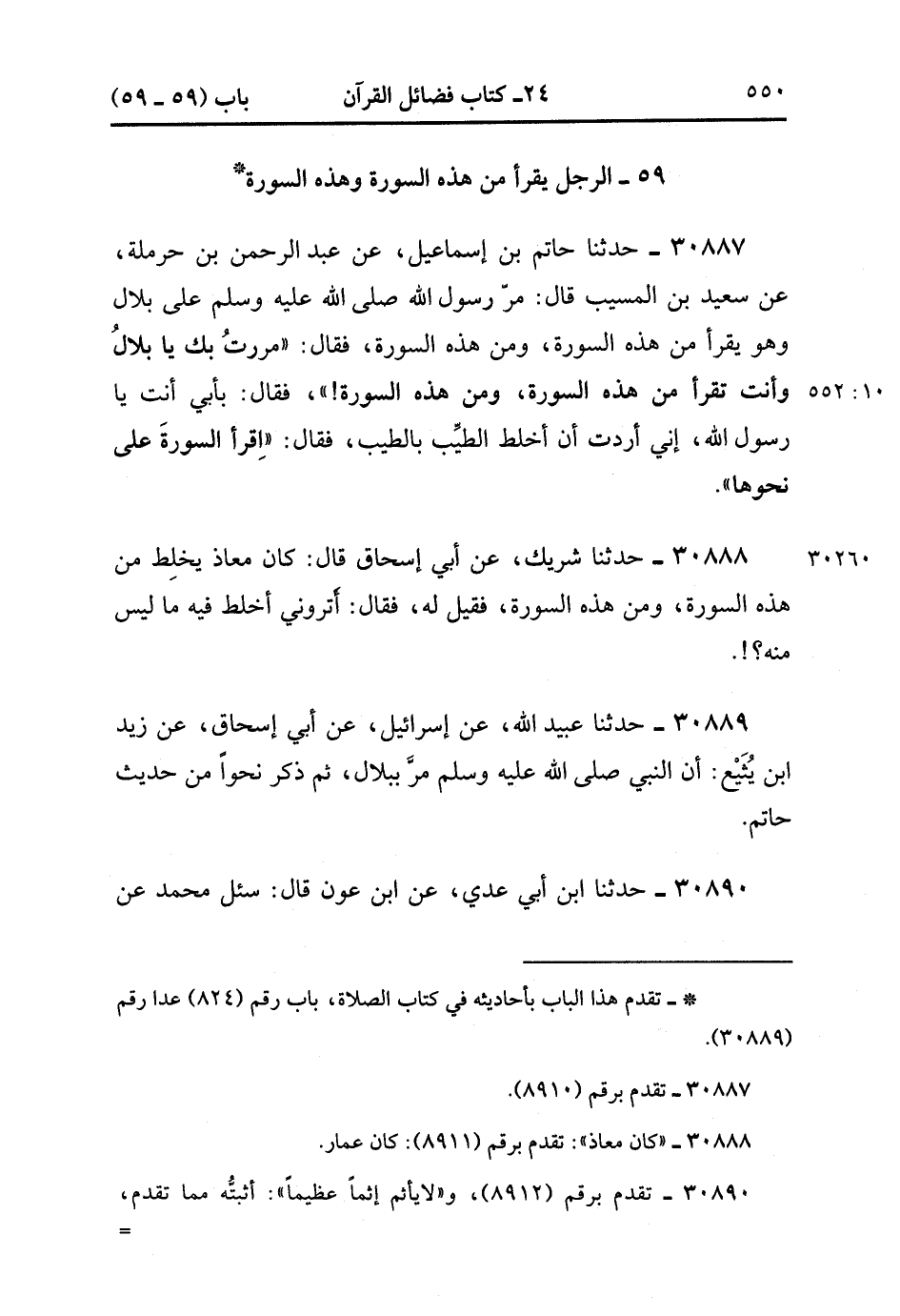 30887- حَدَّثَنَا حَاتِمُ بْنُ إسْمَاعِيلَ ، عَنْ عَبْدِ الرَّحْمَنِ بْنِ حَرْمَلَةَ ، عَنْ سَعِيدِ بْنِ الْمُسَيَّبِ ، قَالَ : مَرَّ رَسُولُ اللهِ صَلَّى الله عَلَيْهِ وَسَلَّمَ عَلَى بِلالٍ وَهُوَ يَقْرَأُ مِنْ هَذِهِ السُّورَةِ وَمِنْ هَذِهِ السُّورَةِ ، فَقَالَ : مَرَرْتُ بِكَ يَا بِلالُ وَأَنْتَ تَقْرَأُ مِنْ هَذِهِ السُّورَةِ وَمِنْ هَذِهِ السُّورَةِ ، فَقَالَ : بِأَبِي أَنْتَ يَا رَسُولَ اللهِ إنِّي أَرَدْت أَنْ أَخْلِطَ الطَّيِّبَ بِالطَّيِّبِ : فَقَالَ : اقْرَأ السُّورَةَ عَلَى نَحْوِهَا. (10/551).