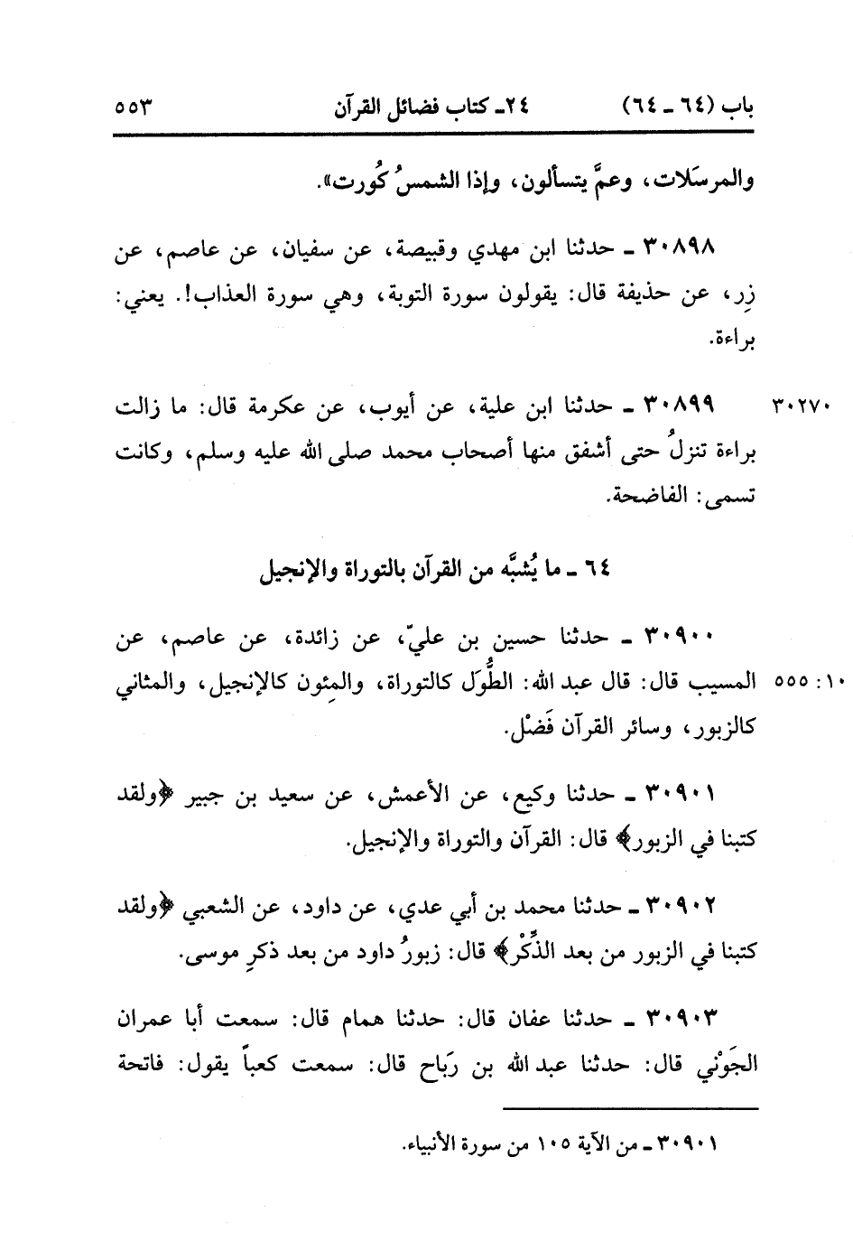 30900- حَدَّثَنَا حُسَيْنُ بْنُ عَلِيٍّ ، عَنْ زَائِدَةَ ، عَنْ عَاصِمٍ ، عَنِ الْمُسَيَّبِ ، قَالَ : قَالَ عَبْدُ اللهِ : الطُّوَّلُ كَالتَّوْرَاةِ ، وَالْمِئِونَ كَالإِنْجِيلِ ، وَالْمَثَانِي كَالزَّبُورِ ، وَسَائِرُ الْقُرْآنِ فَضْلٌ. (10/554).
