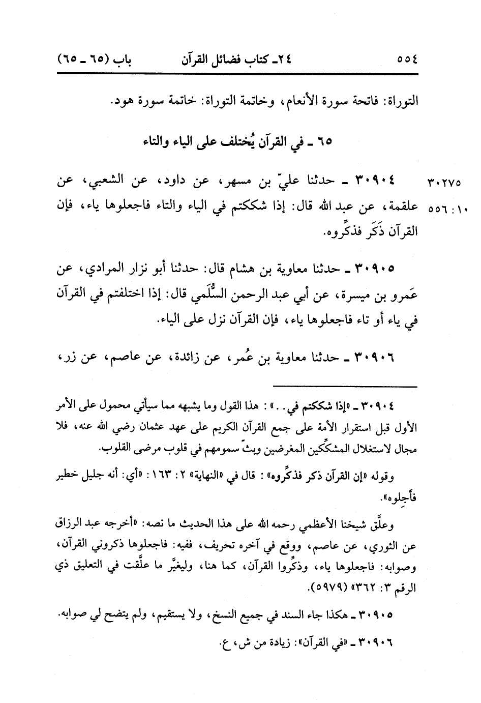 30906- حَدَّثَنَا مُعَاوِيَةُ بْنُ عُمَر ، عَنْ زَائِدَةَ ، عَنْ عَاصِمٍ ، عَنْ زِرٍّ ، عَنْ عَبْدِ اللهِ ، قَالَ : إذَا تَمَارَيْتُمْ فِي الْقُرْآنِ فِي يَاءٍ ، أَوْ تَاءٍ فَاجْعَلُوهَا يَاءً وَذَكِّرُوا الْقُرْآنَ فَإِنَّهُ مُذَكَّرٌ. (10/556).
