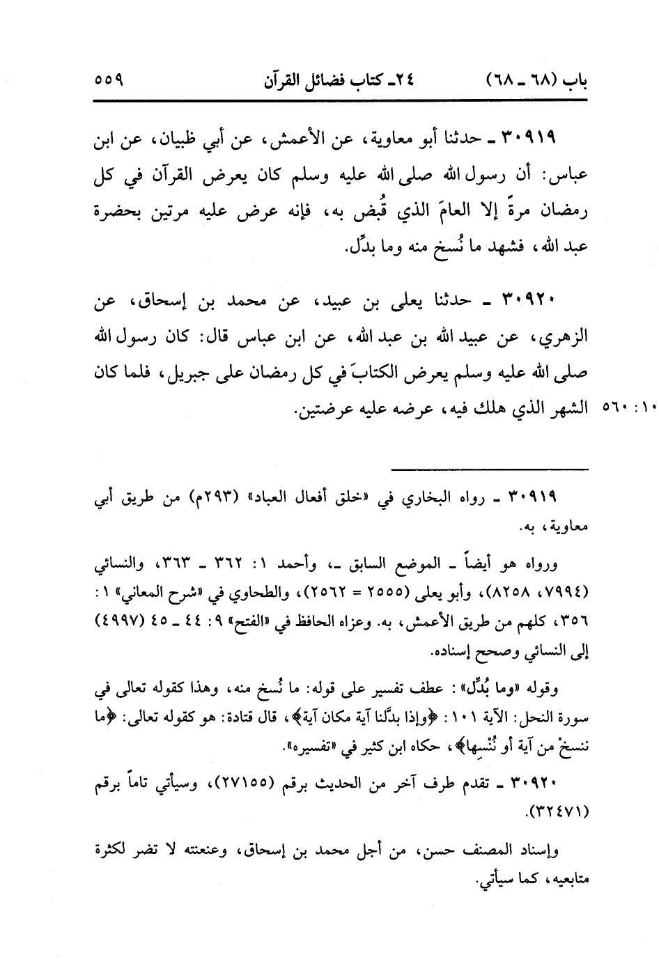 30920- حَدَّثَنَا يَعْلَى بْنُ عُبَيْدٍ ، عَنْ مُحَمَّدِ بْنِ إِسْحَاقَ ، عَنِ الزُّهْرِيِّ ، عَنْ عُبَيْدِ اللهِ بْنِ عبْدِ اللهِ ، عَنِ ابْنِ عَبَّاسٍ ، قَالَ : كَانَ رَسُولُ اللهِ صَلَّى الله عَلَيْهِ وَسَلَّمَ يَعْرِضُ الْكِتَابَ فِي كُلِّ رَمَضَانَ عَلَى جِبْرِيلَ ، فَلَمَّا كَانَ الشَّهْرُ الَّذِي هَلَكَ فِيهِ عَرَضَهُ عَلَيْهِ عَرْضَتَيْنِ. (10/559).