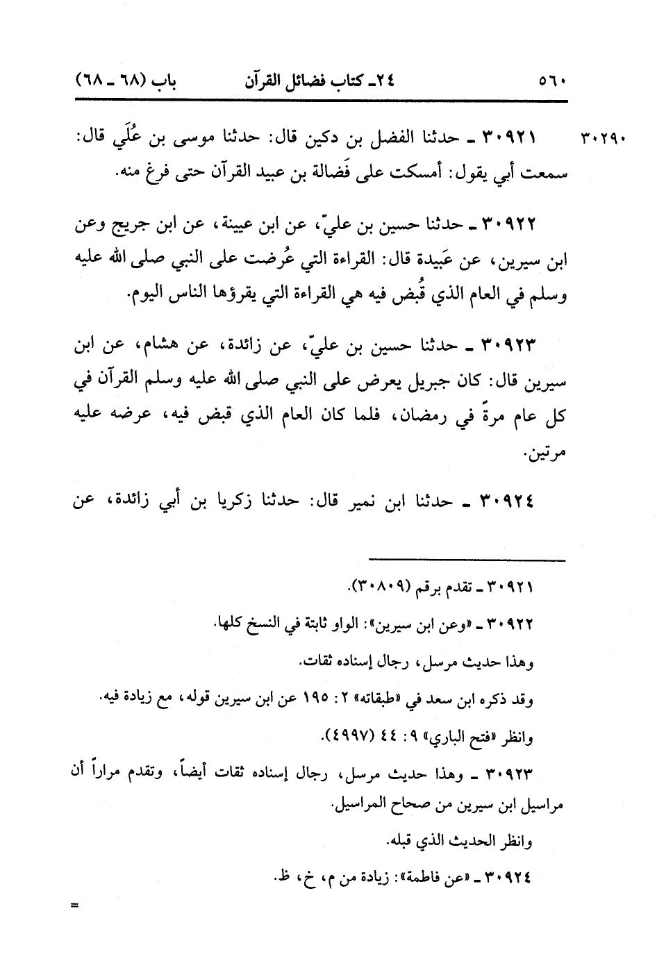 30923- حَدَّثَنَا حُسَيْنُ بْنُ عَلِيٍّ ، عَنْ زَائِدَةَ ، عَنْ هِشَامٍ ، عَنِ ابْنِ سِيرِينَ ، قَالَ : كَانَ جِبْرِيلُ يَعْرِضُ عَلَى النَّبِيِّ صَلَّى الله عَلَيْهِ وَسَلَّمَ الْقُرْآنَ فِي كُلِّ عَامٍ مَرَّةً فِي رَمَضَانَ ، فَلَمَّا كَانَ الْعَامُ الَّذِي قُبِضَ فِيهِ عَرَضَهُ عَلَيْهِ مَرَّتَيْنِ. (10/560).