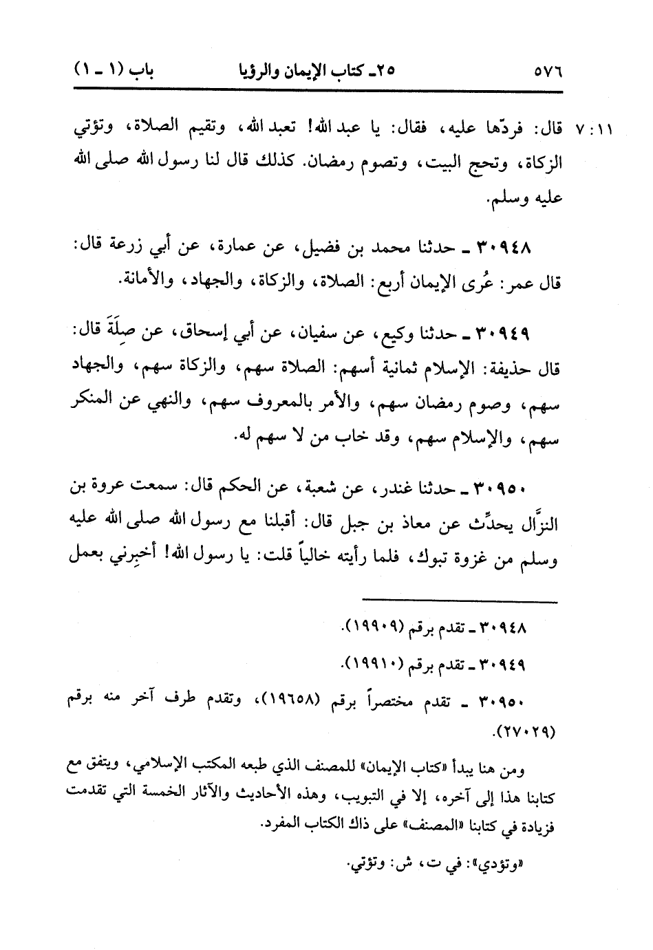 30948- حَدَّثَنَا مُحَمَّدُ بْنُ فُضَيْلٍ ، عَنْ عُمَارَةَ ، عَنْ أَبِي زُرْعَةَ ، قَالَ عُمَرُ : عُرَى الإِيمَانِ أَرْبَعٌ : الصَّلاةُ وَالزَّكَاةُ وَالْجِهَادُ وَالأَمَانَةُ.