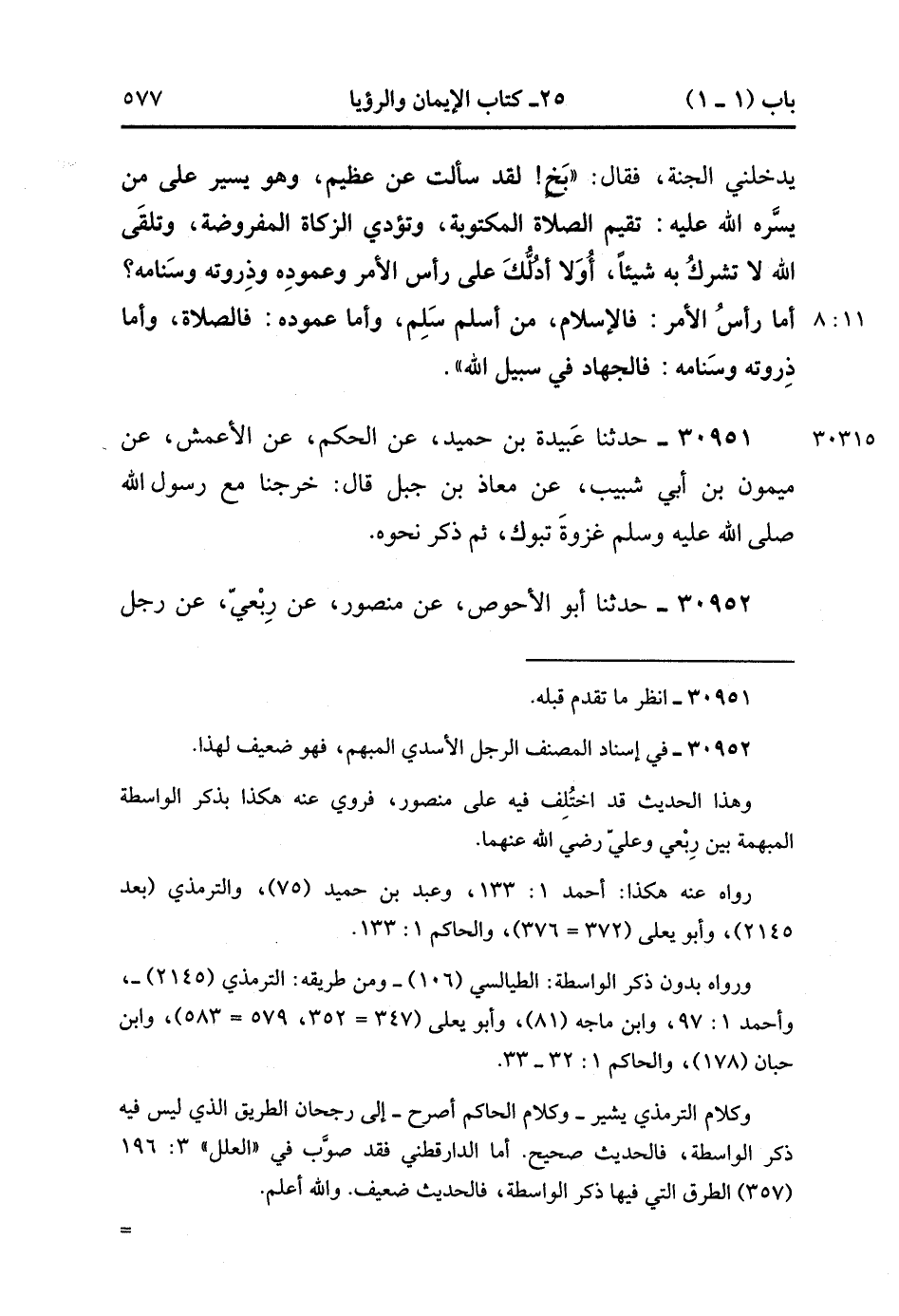 30952- حَدَّثَنَا أَبُو الأَحْوَصِِ ، عَنْ مَنْصُورٍ ، عَنْ رِبْعِيٍّ ، عَنْ رَجُلٍ مِنْ بَنِي أَسَدٍ ، عَنْ عَلِيٍّ ، قَالَ : قَالَ رَسُولُ اللهِ صَلَّى الله عَلَيْهِ وَسَلَّمَ : أَرْبَعٌ لَنْ يَجِدَ رَجُلٌ طَعْمَ الإِيمَانِ حَتَّى يُؤْمِنَ بِهِنَّ : لاَ إلَهَ إلاَّ اللَّهُ وَحْدَهُ , وَأَنِّي رَسُولُ اللهِ بَعَثَنِي بِالْحَقِّ وَبِأَنَّهُ مَيِّتٌ ، ثُمَّ مَبْعُوثٌ مِنْ بَعْدِ الْمَوْتِ وَيُؤْمِنَ بِالْقَدَرِ كُلِّهِ. (11/8).