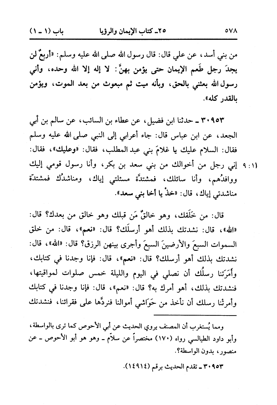 30953- حَدَّثَنَا ابْنُ فُضَيْلٍ ، عَنْ عَطَاءِ بْنِ السَّائِبِ ، عَنْ سَالِمِ بْنِ أَبِي الْجَعْدِ ، عَنِ ابْنِ عَبَّاسٍ ، قَالَ : جَاءَ أَعْرَابِيٌّ إِلَى النَّبِيُّ صَلَّى الله عَلَيْهِ وَسَلَّمَ ، فَقَالَ : السَّلامُ عَلَيْك يَا غُلامَ بَنِي عَبْدِ الْمُطَّلِبِ ، فَقَالَ : وَعَلَيْك ، فَقَالَ : إنِّي رَجُلٌ مِنْ أَخْوَالِكَ مِنْ بَنِي سَعْدِ بْنِ بَكْرٍ وَأَنَا رَسُولُ قَوْمِي (11/8) إلَيْك وَوَافِدُهُمْ وَأَنَا سَائِلُك فَمُشْتَدَّةٌ مَسْأَلَتِي إياك ، وَمُنَاشِدُك فَمُشْتَدَّةٌ مُنَاشَدَتِي إيَّاكَ ، قَالَ : خُذْ يَا أَخَا بَنِي سَعْدٍ ، قَالَ : مَنْ خَلَقَك وَهُوَ خَالِقُ مَنْ قَبْلَك وَهُوَ خَالِقُ مَنْ بَعْدَكَ ؟ قَالَ : اللَّهُ ، قَالَ : نَشَدْتُك بِذَلِكَ أَهُوَ أَرْسَلَك ؟ قَالَ : نَعَمْ ، قَالَ : مَنْ خَلَقَ السَّمَاوَاتِ السَّبْعَ وَالأَرْضِينَ السَّبْعَ وَأَجْرَى بَيْنَهُنَّ الرِّزْقَ ؟ قَالَ : اللَّهُ ، قَالَ : نَشَدْتُك بِذَلِكَ أَهُوَ أَرْسَلِكَ ؟ قَالَ : نَعَمْ ، قَالَ : فَإِنَّا وَجَدْنَا فِي كِتَابِكَ وَأَمَرَتْنَا رُسُلُك أَنْ نُصَلِّيَ فِي الْيَوْمِ وَاللَّيْلَةِ خَمْسَ صَلَوَاتٍ لِمَوَاقِيتِهَا فَنَشَدْتُك بِذَلِكَ أَهُوَ أَمَرَك بِهِ ؟ قَالَ : نَعَمْ ، قَالَ : فَإِنَّا وَجَدْنَا فِي كِتَابِكَ وَأَمَرَتْنَا رُسُلُك أَنْ نَأْخُذَ مِنْ حَوَاشِي أَمْوَالِنَا فَنَرُدَّهَا عَلَى فُقَرَائِنَا فَنَشَدْتُك بِذَلِكَ أَهُوَ أَمَرَك بِذَلِكَ ؟ قَالَ : نَعَمْ ، ثُمَّ قَالَ : أَمَّا الْخَامِسَةُ فَلَسْت سَائلك عنها ، وَلا أَرَبَ لِي فِيهَا ، قَالَ : ثُمَّ قَالَ : أَمَا وَالَّذِي بَعَثَك بِالْحَقِّ لأَعْمَلَنَّ بِهَا وَمَنْ أَطَاعَنِي مِنْ قَوْمِي ، ثُمَّ رَجَعَ فَضَحِكَ رَسُولُ اللهِ صَلَّى الله عَلَيْهِ وَسَلَّمَ حَتَّى بَدَتْ نَوَاجِذُهُ ، ثُمَّ قَالَ : وَالَّذِي نَفْسِي بِيَدِهِ لَئِنْ صَدَقَ لَيَدْخُلَنَّ الْجَنَّةَ. (11/9).
