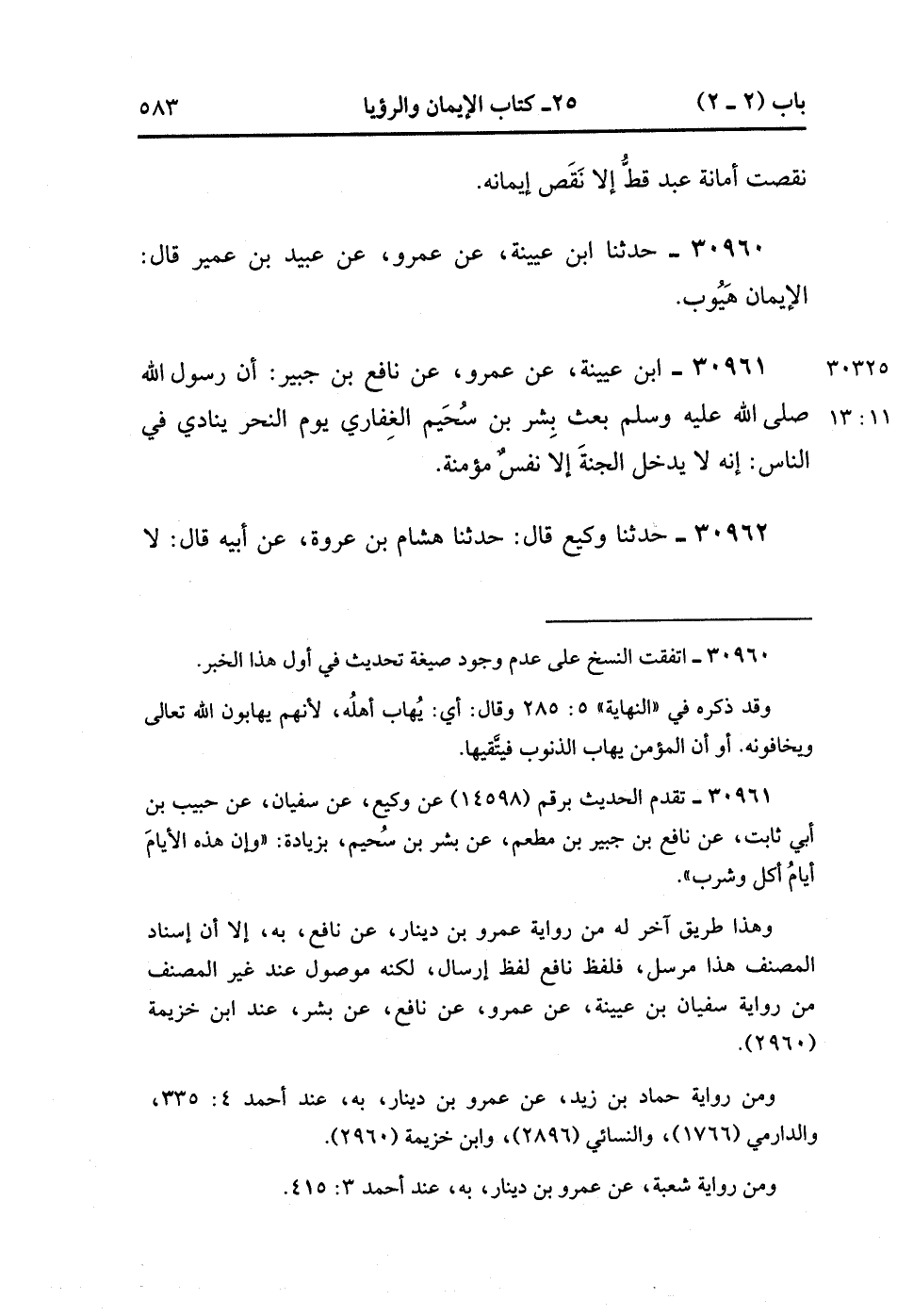 30961- حَدَّثَنَا ابْنُ عُيَيْنَةَ ، عَنْ عَمْرٍو ، عَنْ نَافِعِ بْنِ جُبَيْرٍ ، أَنَّ رَسُولَ اللهِ صَلَّى الله عَلَيْهِ وَسَلَّمَ بَعَثَ بشر بْنَ سُحَيْمٍ الْغِفَارِيَّ يَوْمَ النَّحْرِ يُنَادِي فِي النَّاسِ ، إِنَّهُ لاَ يَدْخُلُ الْجَنَّةَ إلاَّ نَفْسٌ مُؤْمِنَةٌ. (11/12).