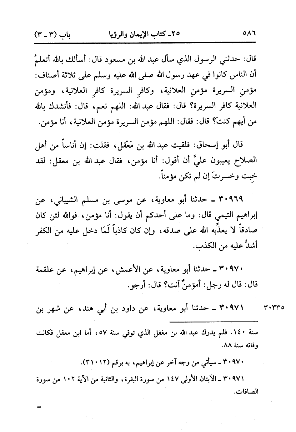 30968- حَدَّثَنَا أَبُو مُعَاوِيَةَ ، عَنِ الشَّيْبَانِيِّ ، عَنْ ثَعْلَبَةَ ، عَنْ أَبِي قِلابَةَ قَالَ : حدَّثَنِي الرَّسُولُ الَّذِي سَأَلَ عَبْدُ اللهِ بْنُ مَسْعُودٍ ، قَالَ : أَسْأَلُك بِاللهِ أَتَعْلَمُ ، أَنَّ النَّاسَ كَانُوا فِي عَهْدِ رَسُولِ اللهِ صَلَّى الله عَلَيْهِ وَسَلَّمَ عَلَى ثَلاثَةِ أَصْنَافٍ مُؤْمِنِ السَّرِيرَةِ وَمُؤْمِنِ الْعَلانِيَةِ ، وَكَافِرِ السَّرِيرَةِ كَافِرِ الْعَلانِيَةِ ، وَمُؤْمِنِ الْعَلانِيَةِ كَافِرِ السَّرِيرَةِ ، قَالَ : فَقَالَ عَبْدُ اللهِ : اللَّهُمَّ نَعَمْ ، قَالَ : فَأَنْشُدُك بِاللهِ : مِنْ أَيِّهِمْ كُنْت ، فَقَالَ : اللَّهُمَّ مُؤْمِنُ السَّرِيرَةِ مُؤْمِنُ الْعَلانِيَةِ ، أَنَا مُؤْمِنٌ ، قَالَ أَبُو إِسْحَاقَ : فَلَقِيت عَبْدَ اللهِ بْنَ مَعْقِلٍ ، فَقُلْتُ : إنَّ أُنَاسًا مِنْ أَهْلِ الصَّلاحِ يَعِيبُونَ عَلَيَّ أَنْ أَقُولَ : أَنَا مُؤْمِنٌ ، فَقَالَ عَبْدُ اللهِ بْنُ مَعْقِلٍ : لَقَدْ خِبْتَ وَخَسِرْت إِنْ لَمْ تَكُنْ مُؤْمِنًا. (11/14).