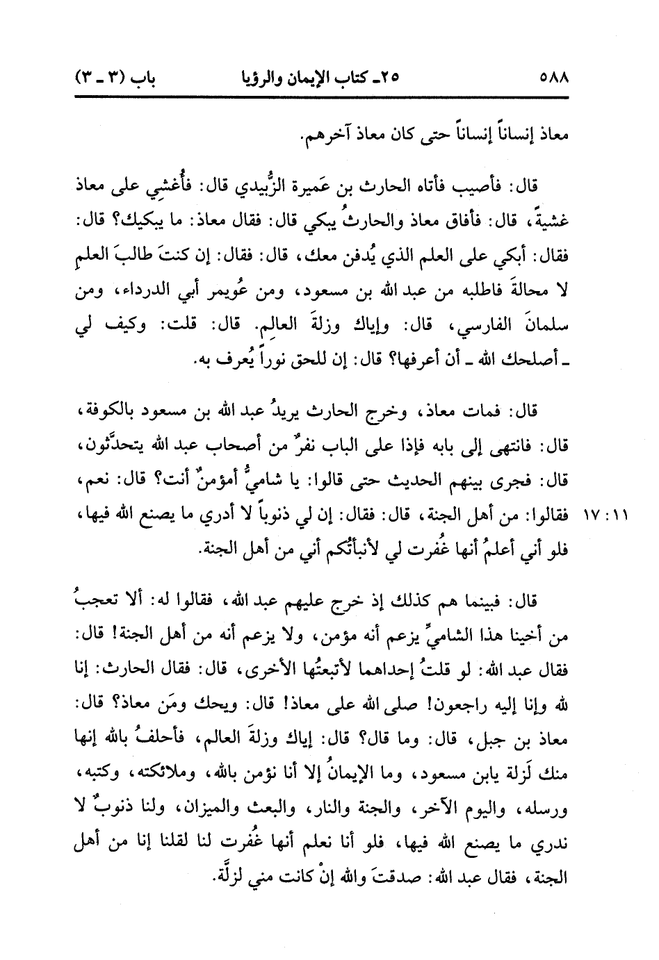 قَالَ : إنَّ لِلْحَقِّ نُورًا يُعْرَفُ بِهِ ، قَالَ : فَمَاتَ مُعَاذٌ وَخَرَجَ الْحَارِثُ يُرِيدُ عَبْدَ اللهِ بْنَ مَسْعُودٍ بِالْكُوفَةِ ، قَالَ : فَانْتَهَى إِلَى بَابِهِ فَإِذَا عَلَى الْبَابِ نَفَرٌ مِنْ أَصْحَابِ عَبْدِ اللهِ يَتَحَدَّثُونَ ، قَالَ : فَجَرَى بَيْنَهُمَ الْحَدِيثُ حَتَّى ، قَالُوا : يَا شَامِيُّ أَمُؤْمِنٌ أَنْتَ ؟ قَالَ : نَعَمْ ، فَقَالُوا : مِنْ أَهْلِ الْجَنَّةِ ؟ قَالَ : فَقَالَ : إنَّ لِي ذُنُوبًا لاَ أَدْرِي مَا يَصْنَعُ اللَّهُ فِيهَا (11/16) فَلَوْ أني أَعْلَمُ ، أَنَّهَا غُفِرَتْ لِي لأَنْبَأْتُكُمْ أَنِّي مِنْ أَهْلِ الْجَنَّةِ ، قَالَ : فَبَيْنَمَا هُمْ كَذَلِكَ إذْ خَرَجَ عَلَيْهِمْ عَبْدُ اللهِ ، فَقَالُوا لَهُ : أَلا تَعْجَبُ مِنْ أَخِينَا هَذَا الشَّامِيِّ يَزْعُمُ أَنَّهُ مُؤْمِنٌ ، ولا يَزْعُمُ أَنَّهُ مِنْ أَهْلِ الْجَنَّةِ ، قَالَ : فَقَالَ عَبْدُ اللهِ : لَوْ قُلْتُ إحْدَاهُمَا لاتَّبَعَتُهَا الأُخْرَى ، قَالَ : فَقَالَ الْحَارِثُ : {إنَّا لِلَّهِ وَإِنَّا إلَيْهِ رَاجِعُونَ} صَلَّى اللَّهُ عَلَى مُعَاذٍ ، قَالَ : وَيْحَك وَمَنْ مُعَاذٌ ، قَالَ : مُعَاذُ بْنُ جَبَلٍ ، قَالَ : وَمَا قَالَ ؟ قَالَ : إيَّاكَ وَزَلَّةَ الْعَالِمِ فَأحْلِفُ بِاللهِ ، أَنَّهَا مِنْك لَزَلَّةٌ يَا ابْنَ مَسْعُودٍ ، وَمَا الإِيمَانُ إلاَّ أَنَّا نُؤْمِنُ بِاللهِ وَمَلائِكَتِهِ وَكُتُبِهِ وَرُسُلِهِ وَالْيَوْمِ الآخِرِ وَالْجَنَّةِ وَالنَّارِ وَالْبَعْثِ وَالْمِيزَانِ ، وَإِنَّ لَنَا ذُنُوبًا لاَ نَدْرِي مَا يَصْنَعُ اللَّهُ فِيهَا ، فَلَوْ أنا نَعْلَمُ أَنَّهَا غُفِرَتْ لَنَا لَقُلْنَا : إنَّا مِنْ أَهْلِ الْجَنَّةِ ، فَقَالَ عَبْدُ اللهِ : صَدَقْت وَاللهِ إِنْ كَانَتْ مِنِّي لَزَلَّةً. (11/17).