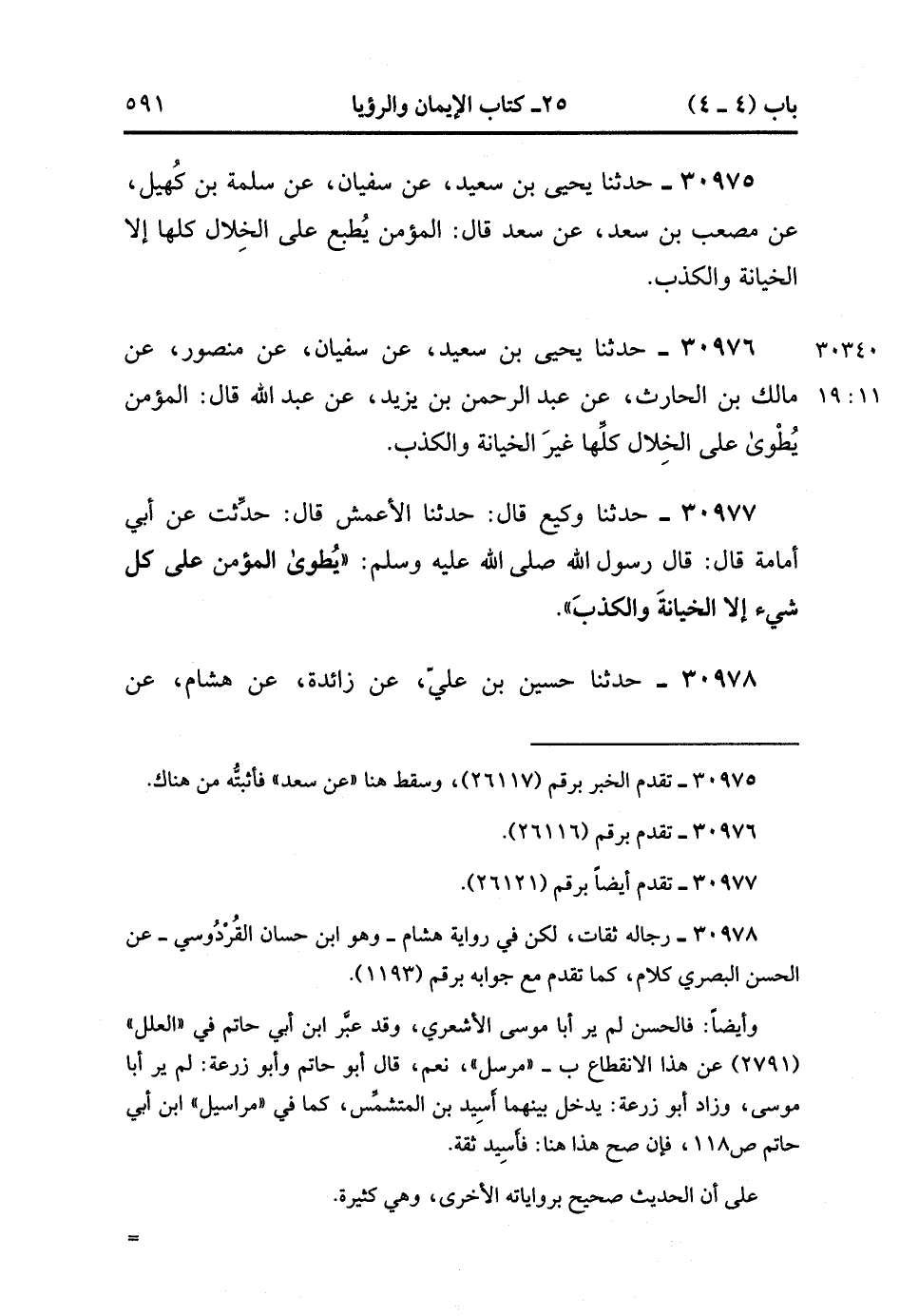 30976- حَدَّثَنَا يَحْيَى بْنُ سَعِيدٍ ، عَنْ سُفْيَانَ ، عَنْ مَنْصُورٍ ، عَنْ مَالِكِ بْنِ الْحَارِثِ ، عَنْ عَبْدِ الرَّحْمَنِ بْنِ يَزِيدَ ، عَنْ عَبْدِ اللهِ ، قَالَ : الْمُؤْمِنُ يُطْوَى عَلَى الْخِلالِ كُلِّهَا غَيْرَ الْخِيَانَةِ وَالْكَذِبِ. (11/18).