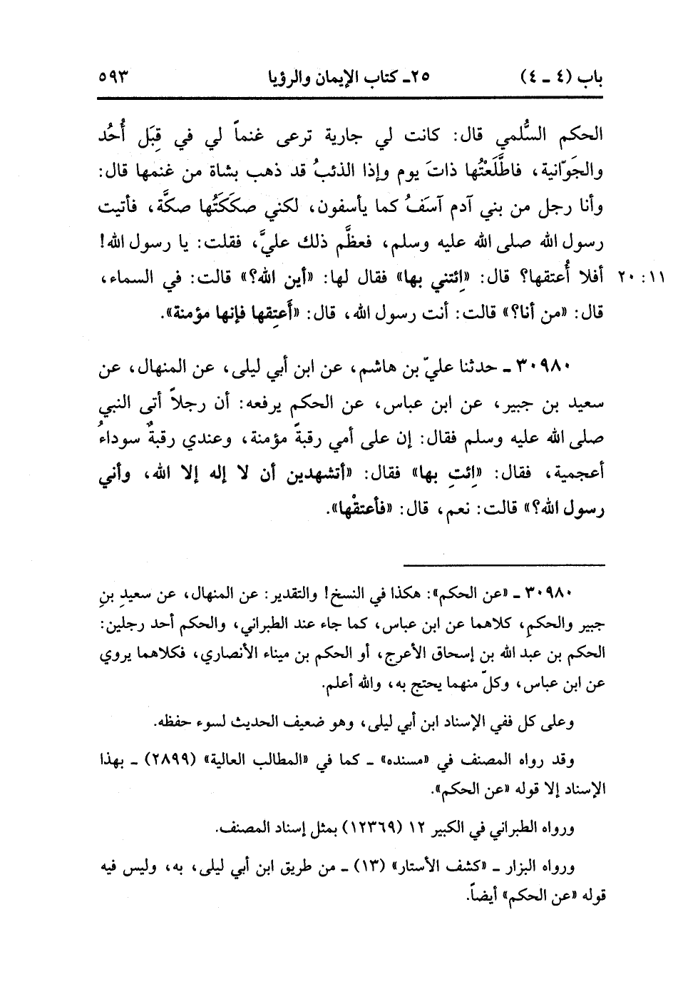 30980- حَدَّثَنَا عَلِيُّ بْنُ هَاشِمٍ ، عَنِ ابْنِ أَبِي لَيْلَى ، عَنِ الْمِنْهَالِ ، عَنْ سَعِيدِ بْنِ جُبَيْرٍ ، عَنِ ابْنِ عَبَّاسٍ ، وَعَنِ (1) الْحَكَمِ يَرْفَعُهُ ، أَنَّ رَجُلاً أَتَى النَّبِيُّ صَلَّى الله عَلَيْهِ وَسَلَّمَ ، فَقَالَ : إنَّ عَلَى أُمِّي رَقَبَةً مُؤْمِنَةً ، وَعِنْدِي رَقَبَةٌ سَوْدَاءُ أَعْجَمِيَّةٌ ، فَقَالَ : ائْتِ بِهَا ، فَقَالَ : أَتَشْهَدِينَ أَنْ لاَ إلَهَ إلاَّ اللَّهُ وَأَنِّي رَسُولُ اللهِ ؟ قَالَتْ : نَعَمْ ، قَالَ : فَأَعْتِقْهَا. (11/20).