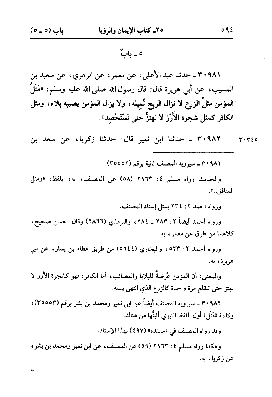 30981- حَدَّثَنَا عَبْدُ الأَعْلَى ، عَنْ مَعْمَرٍ ، عَنِ الزُّهْرِيِّ ، عَنْ سَعِيدِ بْنِ الْمُسَيَّبِ ، عَنْ أَبِي هُرَيْرَةَ ، قَالَ : قَالَ رَسُولُ اللهِ صَلَّى الله عَلَيْهِ وَسَلَّمَ : مَثَلُ الْمُؤْمِنِ مَثَلُ الزَّرْعِ ، لاَ تَزَالُ الرِّيحُ تُمِيلُهُ ، وَلا يَزَالُ الْمُؤْمِنُ يُصِيبُهُ بَلاءٌ ، وَمَثَلُ الْكَافِرِ كَمَثَلِ شَجَرَةِ الأَرْزِ ، لاَ تَهْتَزُّ حَتَّى تَسْتَحْصِدَ.(11/20).