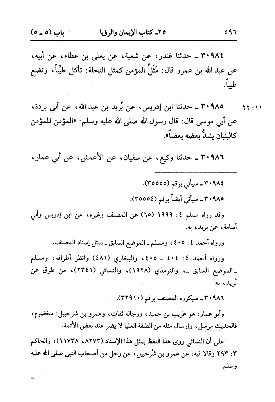 30985- حَدَّثَنَا ابْنُ إدْرِيسَ ، عَنْ بُرَيْدِ بْنِ عَبْدِ اللهِ ، عَنْ أَبِي بُرْدَةَ عَنْ أَبِي مُوسَى ، قَالَ : قَالَ رَسُولُ اللهِ صَلَّى الله عَلَيْهِ وَسَلَّمَ : الْمُؤْمِنُ لِلْمُؤْمِنِ كَالْبُنْيَانِ يَشُدُّ بَعْضُهُ بَعْضًا. (11/21).