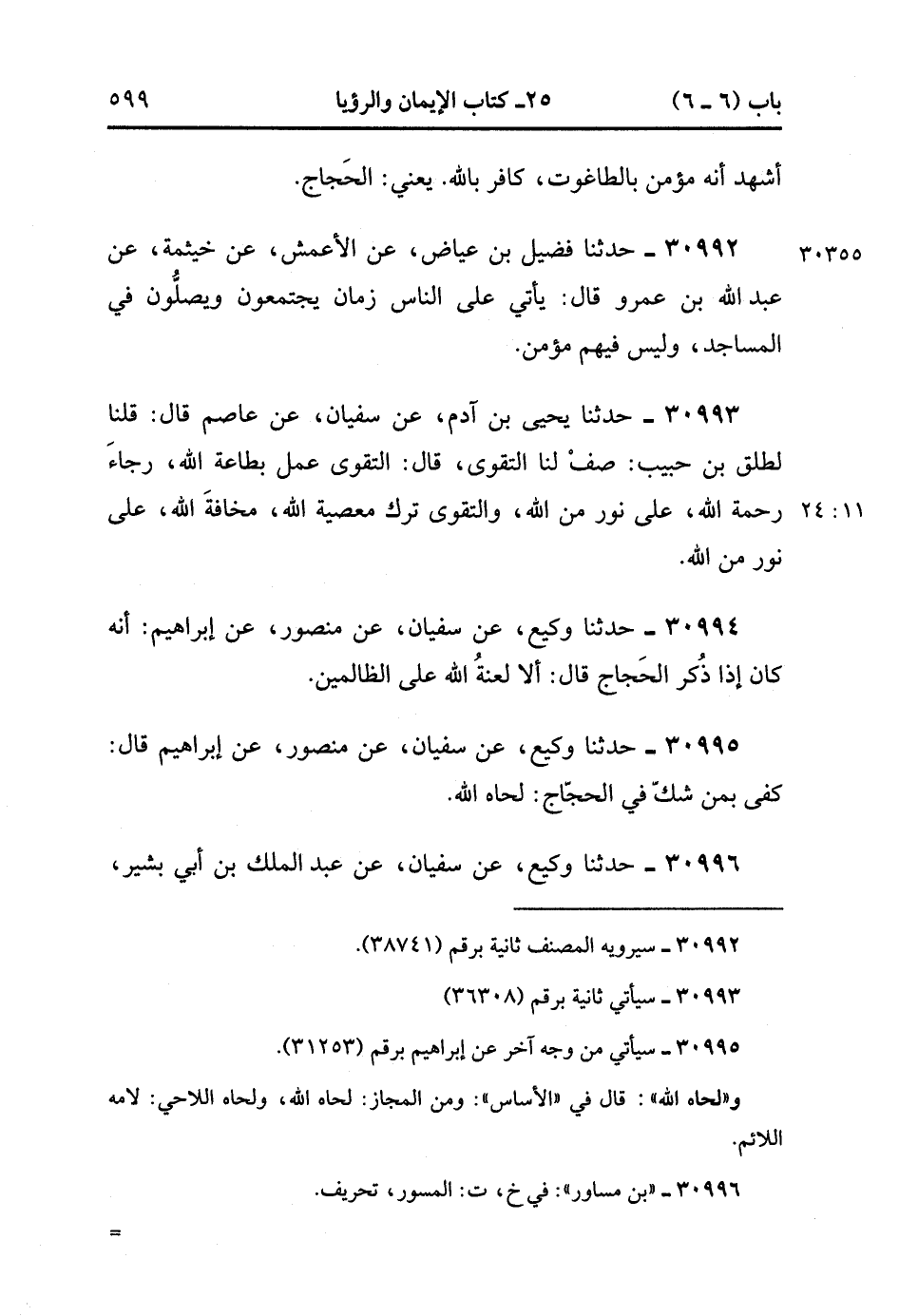 30995- حَدَّثَنَا وَكِيعٌ ، عَنْ سُفْيَانَ ، عَنْ مَنْصُورٍ ، عَنْ إبْرَاهِيمَ ، قَالَ : كَفَى بِمَنْ شَكَّ فِي الْحَجَّاجِ لَحَاهُ اللَّهُ. (11/24).