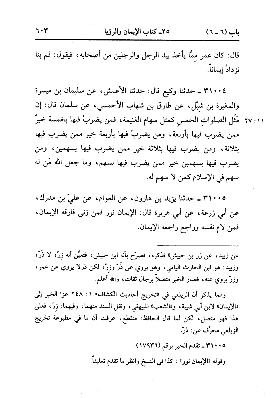 31005- حَدَّثَنَا يَزِيدُ بْنُ هَارُونَ ، عَنِ الْعَوَّامِ ، عَنْ عَلِيِّ بْنِ مُدْرِكٍ ، عَنْ أَبِي زُرْعَةَ ، عَنْ أَبِي هُرَيرَةَ ، قَالَ الإِيمَانُ نُورٌ ، فَمَنْ زَنَا فَارَقَهُ الإِيمَانُ ، فَمَنْ لامَ نَفْسَهُ وَرَاجَعَ رَاجَعَهُ الإِيمَانُ. (11/27).