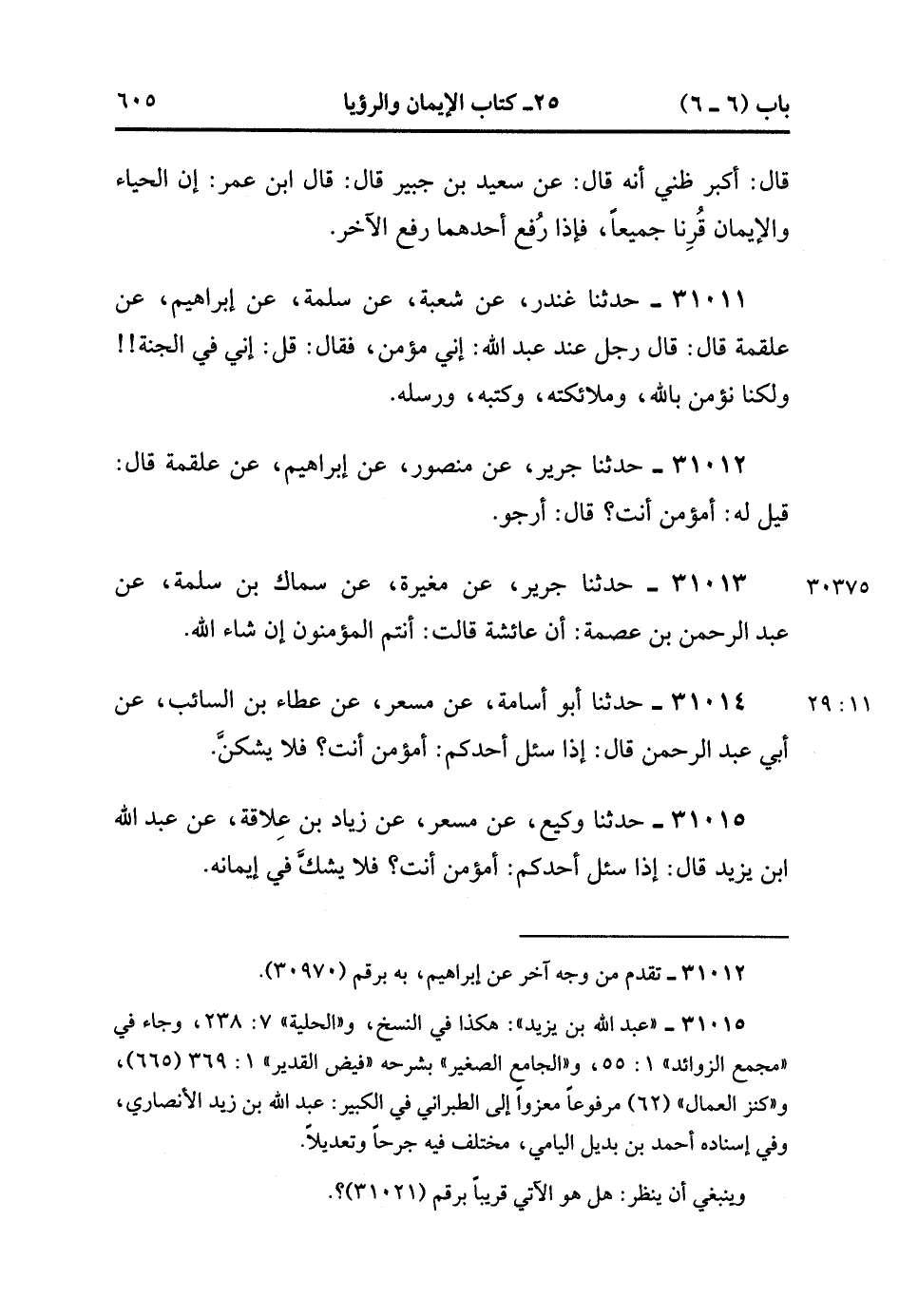 31012- حَدَّثَنَا جَرِيرٌ ، عَنْ مَنْصُورٍ ، عَنْ إِبْرَاهِيمَ ، عَنْ عَلْقَمَةَ ، قَالَ : قيلَ لَهُ : أَمُؤْمِنٌ أَنْتَ ، قَالَ : أَرْجُو. (11/28).