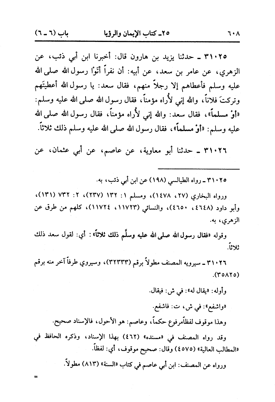 31025- حَدَّثَنَا يَزِيدُ بْنُ هَارُونَ , قَالَ : أَخْبَرَنَا ابْنُ أَبِي ذِئْبٍ ، عَنِ الزُّهْرِيِّ ، عَنْ عَامِرِ بْنِ سَعْدٍ ، عَنْ أَبِيهِ ، أَنَّ نَفَرًا أَتَوْا رَسُولَ اللهِ صَلَّى الله عَلَيْهِ وَسَلَّمَ فَأَعْطَاهُمْ إلاَّ رَجُلاً مِنْهُمْ ، فَقَالَ سَعْدٌ : يَا رَسُولَ اللهِ ، أَعْطَيْتَهُمْ وَتَرَكْتَ فُلانًا وَاللهِ إنِّي لأُرَاهُ مُؤْمِنًا ، فَقَالَ رَسُولُ اللهِ صَلَّى الله عَلَيْهِ وَسَلَّمَ : أَوْ مُسْلِمًا ، فَقَالَ سَعْدٌ : وَاللهِ إنِّي لأرَاهُ مُؤْمِنًا ، فَقَالَ رَسُولُ اللهِ صَلَّى الله عَلَيْهِ وَسَلَّمَ : أَوْ مُسْلِمًا ، فَقَالَ رَسُولُ اللهِ صَلَّى الله عَلَيْهِ وَسَلَّمَ ذَلِكَ ثَلاثًا.