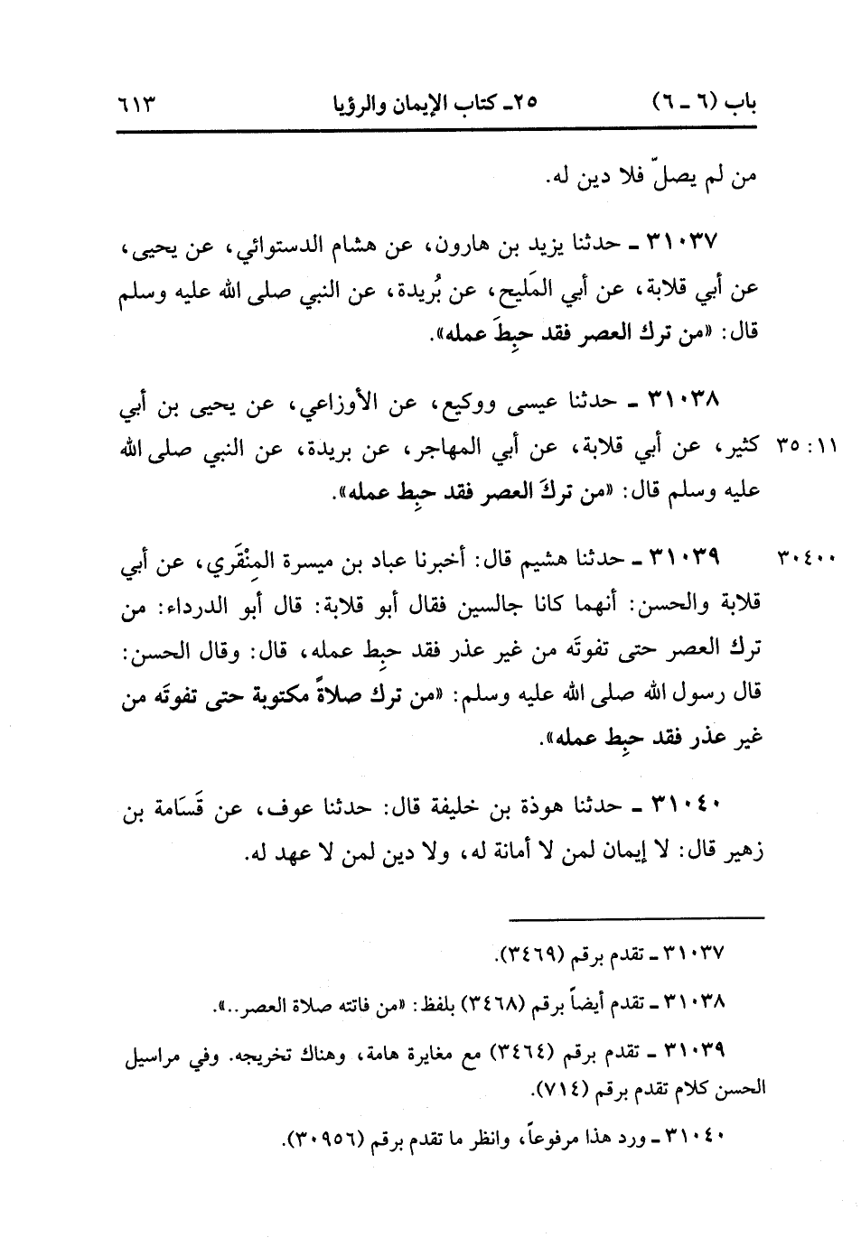 31038- حَدَّثَنَا عِيسَى ، وَوَكِيعٌ ، عَنِ الأَوْزَاعِيِّ ، عَنْ يَحْيَى بْنِ أَبِي كَثِيرٍ ، عَنْ أَبِي قِلابَةَ ، عَنْ أَبِي الْمُهَاجِرِ ، عَنْ بُرَيْدَةَ ، عَنِ النَّبِيِّ صَلَّى الله عَلَيْهِ وَسَلَّمَ ، قَالَ : مَنْ تَرَكَ الْعَصْرَ فَقَدْ حَبِطَ عَمَلُهُ. (11/34).