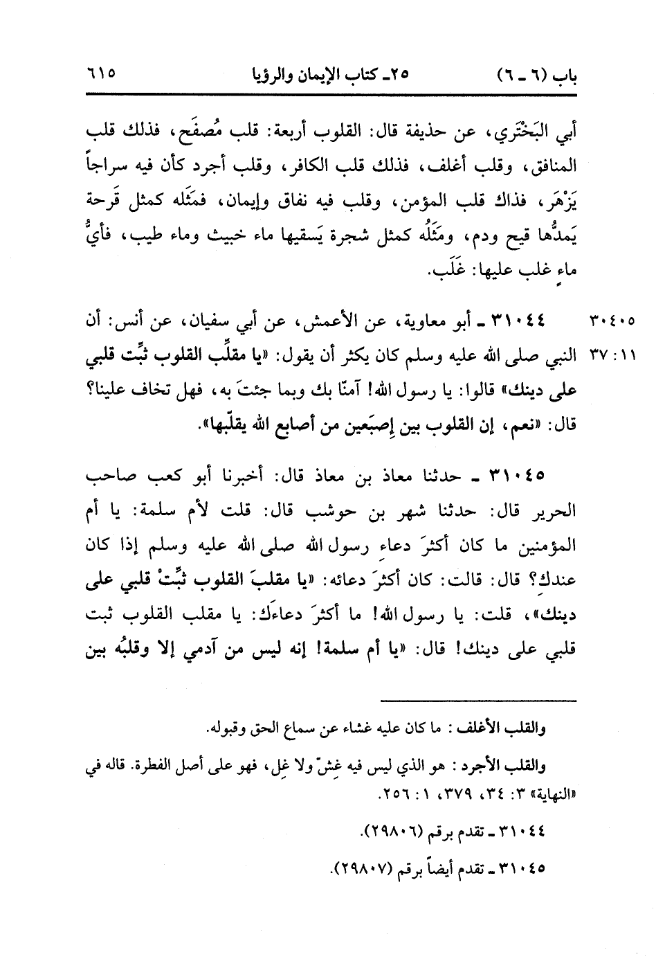 31045- حَدَّثَنَا مُعَاذُ بْنُ مُعَاذٍ , قَالَ : أَخْبَرَنَا أَبُو كَعْبٍ صَاحِبُ الْحَرِيرِ ، قَالَ : حَدَّثَنَا شَهْرُ بْنُ حَوْشَبٍ ، قَالَ : قُلْتُ لأمِّ سَلَمَةَ : يَا أُمَّ الْمُؤْمِنِينَ مَا كَانَ أَكْثَرُ دُعَاءِ رَسُولِ اللهِ صَلَّى الله عَلَيْهِ وَسَلَّمَ إذَا كَانَ عِنْدَكَ ، قَالَ : قُلْتُ : كَانَ أَكْثَرُ دُعَائِهِ : يَا مُقَلِّبَ الْقُلُوبِ ثَبِّتْ قَلْبِي عَلَى دِينِكَ ، قُلْتُ : يا رسول الله ، مَا أَكْثَرُ دُعَائِكَ يَا مُقَلِّبَ الْقُلُوب ثَبِّتْ قَلْبِي عَلَى دِينِكَ قَالَ : يَا أُمَّ سَلَمَةَ : إِنَّهُ لَيْسَ من آدَمِيٌّ إلاَّ وَقَلْبُهُ بَيْنَ إصْبَعَيْنِ مِنْ أَصَابِعِ اللهِ مَا شَاءَ أَقَامَ ، وَمَا شَاءَ أَزَاغَ. (11/37).