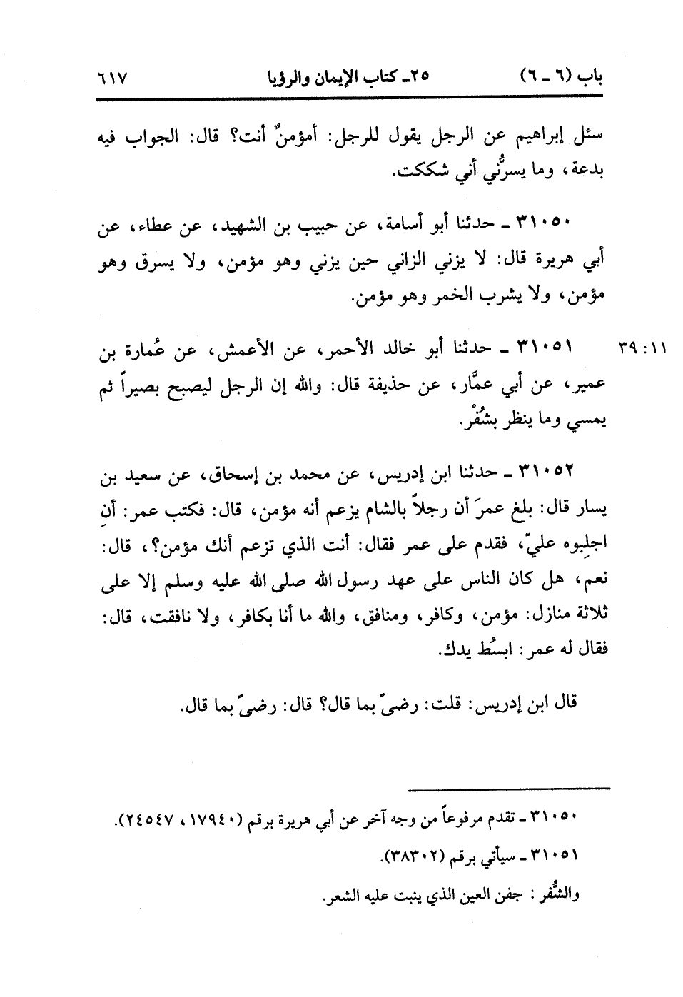 31052- حَدَّثَنَا ابْنُ إدْرِيسَ ، عَنْ مُحَمَّدِ بْنِ إِسْحَاقَ ، عَنْ سَعِيدِ بْنِ يَسَارٍ ، قَالَ : بَلَغَ عُمَرَ ، أَنَّ رَجُلاً بِالشَّامِ يَزْعُمُ ، أَنَّهُ مُؤْمِنٌ ، قَالَ : فَكَتَبَ عُمَرُ : أَنِ اجْلِبُوهُ عَلَي ، فَقَدِمَ عَلَى عُمَرَ ، فَقَالَ : أَنْتَ الَّذِي تَزْعُمُ أَنَّك مُؤْمِنٌ ، قَالَ : نَعَمْ ، قَالَ : هَلْ كَانَ النَّاسُ عَلَى عَهْدِ رَسُولِ اللهِ صَلَّى الله عَلَيْهِ وَسَلَّمَ إلاَّ عَلَى ثَلاثَةِ مَنَازِلَ : مُؤْمِنٌ وَكَافِرٌ وَمُنَافِقٌ ، وَاللهِ مَا أَنَا بِكَافِرٍ ، وَلا نَافَقْتُ ، قَالَ : فَقَالَ لَهُ عُمَرُ : ابْسُطْ يَدَك ، قَالَ ابْنُ إدْرِيسَ : قُلْتُ : رَضِىً بِمَا قَالَ : قَالَ : رَضِىً بِمَا قَالَ. (11/39).