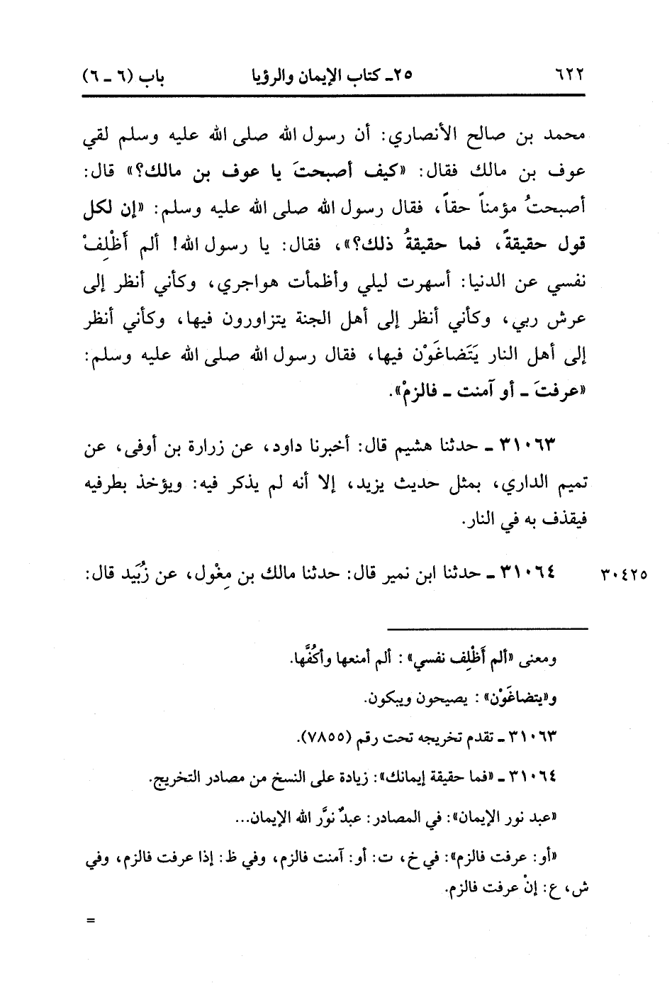 31062- حَدَّثَنَا يُونُسَ بْن هَارُونَ , قَالَ : أَخْبَرَنَا أَبُو مَعْشَرٍ ، عَنْ مُحَمَّدِ بْنِ صَالِحٍ الأَنْصَارِيِّ ، أَنَّ رَسُولَ اللهِ صَلَّى الله عَلَيْهِ وَسَلَّمَ لَقِيَ عَوْفَ بْنَ مَالِكٍ ، فَقَالَ : كَيْفَ أَصْبَحْت يَا عَوْفَ بْنَ مَالِكٍ ، قَالَ : أَصْبَحْت مُؤْمِنًا حَقًّا ، فَقَالَ رَسُولُ اللهِ صَلَّى الله عَلَيْهِ وَسَلَّمَ : إنَّ لِكُلِّ قَوْلٍ حَقِيقَةً ، فَمَا ذَلِكَ ، فَقَالَ : يَا رَسُولَ اللهِ : أَلَمْ أَظْلف نَفْسِي ، عَنِ الدُّنْيَا ، أسْهَرْت لَيْلِي وَأَظْمَأْت هَوَاجِرِي , وَكَأَنِّي أَنْظُرُ إِلَى عَرْشِ رَبِّي ، وَكَأَنِّي أَنْظُرُ إِلَى أَهْلِ الْجَنَّةِ يَتَزَاوَرُونَ فِيهَا ، وَكَأَنِّي أَنْظُرُ إِلَى أَهْلِ النَّارِ يَتَضَاغُونَ فِيهَا ، فَقَالَ رَسُولُ اللهِ صَلَّى الله عَلَيْهِ وَسَلَّمَ : عَرَفْت أَوْ آمَنْت فَالْزَمْ.
