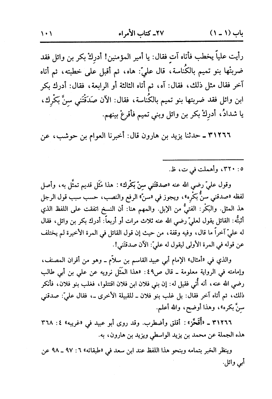 31265- حَدَّثَنَا عَفَّانُ ، قَالَ : نَا أَبُو عَوَانَةَ ، عَنِ الْمُغِيرَةِ ، عَنْ قُدَامَةَ بْنِ عِتَابٍ ، قَالَ : رَأَيْتُ عَلِيًّا يَخْطُبُ فَأَتَاهُ آتٍ ، فَقَالَ : يَا أَمِيرَ الْمُؤْمِنِينَ ، أَدْرِكْ بَكْرَ بْنَ وَائِلٍ فَقَدْ ضَرَبَتْهَا بَنُو تَمِيمٍ بِالْكُنَاسَةِ ، قَالَ عَلِيٌّ : هَاه ، ثُمَّ أَقْبَلَ عَلَى خُطْبَتِهِ ، ثُمَّ أَتَاهُ آخَرُ فَقَالَ مِثْلَ ذَلِكَ ، فَقَالَ : آهٍ ، ثُمَّ أَتَاهُ الثَّالِثَةَ ، أَو الرَّابِعَةَ ، فَقَالَ : أَدْرِكْ بَكْرَ بْنَ وَائِلٍ فَقَدْ ضَرَبَتْهَا بَنُو تَمِيمٍ هِيَ بِالْكُنَاسَةِ ، فَقَالَ : الآن صَدَقْتنِي سِن بَكْرِكَ يَا شَدَّادُ ؟ أَدْرِكْ بَكْرَ بْنَ وَائِلٍ وَبَنِي تَمِيمٍ فَأَقْرِعْ بَيْنَهُمْ.