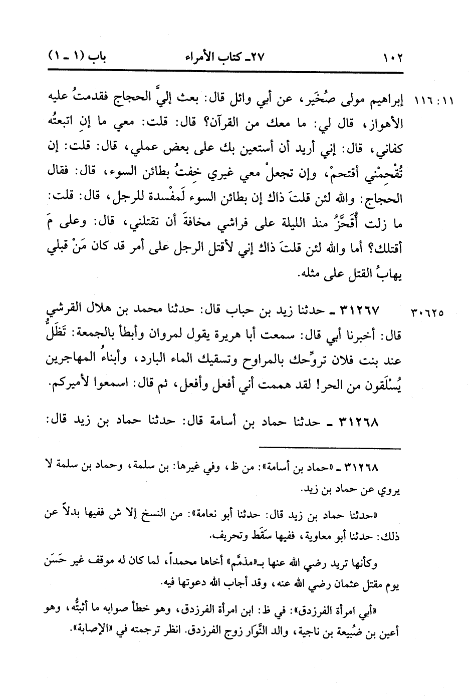 31268- حَدَّثَنَا حَمَّادُ بْنُ أُسَامَةَ , قَالَ : حدَّثَنَا حماد بن زيد , قَالَ : حدَّثَنَا أَبُو نَعَامَةَ عَمْرُو بْنُ عِيسَى ، قَالَ : قَالَتْ عَائِشَةُ : اللَّهُمَّ أَدْرِكْ خُفْرَتَكَ فِي عُثْمَانَ وَأَبْلِغَ الْقِصَاصَ فِي مُذَمَّمْ وَأَبْدِ عَوْرَة أَعْيَن رَجُلٌ مِنْ بَنِي تَمِيمٍ أَبِي امْرَأَةِ الْفَرَزْدَقَ.(11/116).