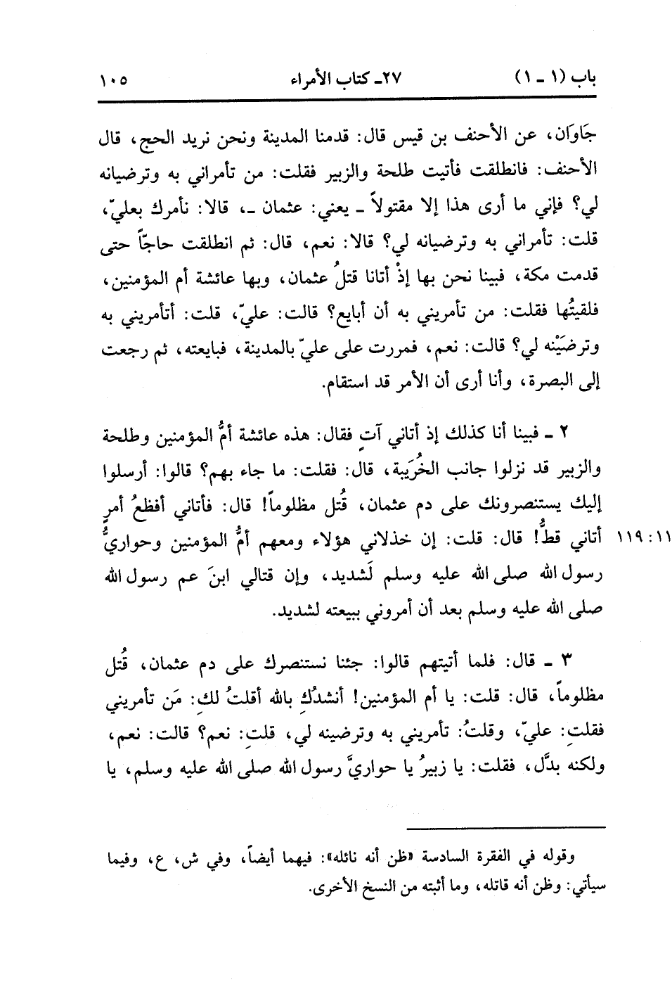 قَالَ : فَلَمَّا أَتَيْتهمْ ، قَالوا : جِئْنَا نَسْتَنْصِرُك عَلَى دَمِ عُثْمَانَ قُتِلَ مَظْلُومًا ، قَالَ : قُلْتُ : يَا أُمَّ الْمُؤْمِنِينَ ، أُنْشِدُك بِاللهِ أَقُلْتُ لَكِ : مَنْ تَأْمُرِينِي فَقُلْتِ : عَلِيّ ، وَقُلْتُ : تَأْمُرِينِي بِهِ وَتَرْضِينَهُ لِي ؟ قُلْتُ : نَعَم ؟ قَالَتْ : نَعَمْ ، وَلَكِنَّهُ بَدَّل ، فَقُلْتُ : يَا زُبَيْرُ يَا حَوَارِيَّ رَسُولِ اللهِ صَلَّى الله عَلَيْهِ وَسَلَّمَ ، يَا طَلْحَةُ ، نَشَدْتُكُمَا بِاللهِ : أَقُلْت لَكُمَا : مَنْ تَأْمُرَانِي بِهِ ، فَقُلْتُمَا : عَلِيًّا ، فَقُلْتُ : تَأْمُرَانِي بِهِ وَتَرْضَيَانِهِ لِي ، فَقُلْتُمَا : نَعَمْ ؟ قَالاَ : بَلَى ، وَلَكِنَّهُ بَدَّلَ.