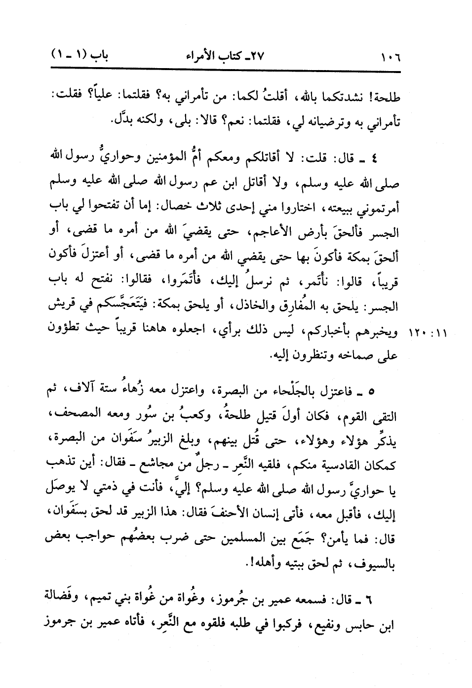 فَاعْتَزَلَ بِالْجَلْحَاءِ مِنَ الْبَصْرَةِ وَاعْتَزَلَ مَعَهُ زُهَاءُ سِتَّةِ آلاَفٍ ، ثُمَّ الْتَقَى الْقَوْمُ ، فَكَانَ أَوَّلُ قَتِيلٍ طَلْحَةَ وَكَعْبَ بْنَ سُورٍ وَمَعَهُ الْمُصْحَفُ ، يُذَكِّرُ هَؤُلاَءِ وَهَؤُلاَءِ حَتَّى قُتِلَ بَيْنَهُمْ ، وَبَلَغَ الزُّبَيْرُ سَفَوَانَ مِنَ الْبَصْرَةِ كَمَكَانِ الْقَادِسِيَّةِ مِنْكُمْ ، فَلَقِيَهُ النَّعِرُ : رَجُلٌ مِنْ مُجَاشِعٍ ، فَقَالَ : أَيْنَ تَذْهَبُ يَا حَوَارِيَّ رَسُولِ اللهِ صَلَّى الله عَلَيْهِ وَسَلَّمَ ؟ إلَيَّ ، فَأَنْتَ فِي ذِمَّتِي لاَ يُوصَلُ إلَيْك ، فَأَقْبَلَ مَعَهُ ، فَأَتَى إنْسَانٌ الأَحْنَفَ ، فَقَالَ : هَذَا الزُّبَيْرُ قَدْ لَحِقَ بِسَفوَانَ ، قَالَ : فَمَا يَأْمَن ؟ جَمَعَ بَيْنَ الْمُسْلِمِينَ حَتَّى ضَرَبَ بَعْضُهُمْ حَوَاجِبَ بَعْضٍ بِالسُّيُوفِ ، ثُمَّ لَحِقَ بِبَيْتهِ وَأَهْلِهِ.