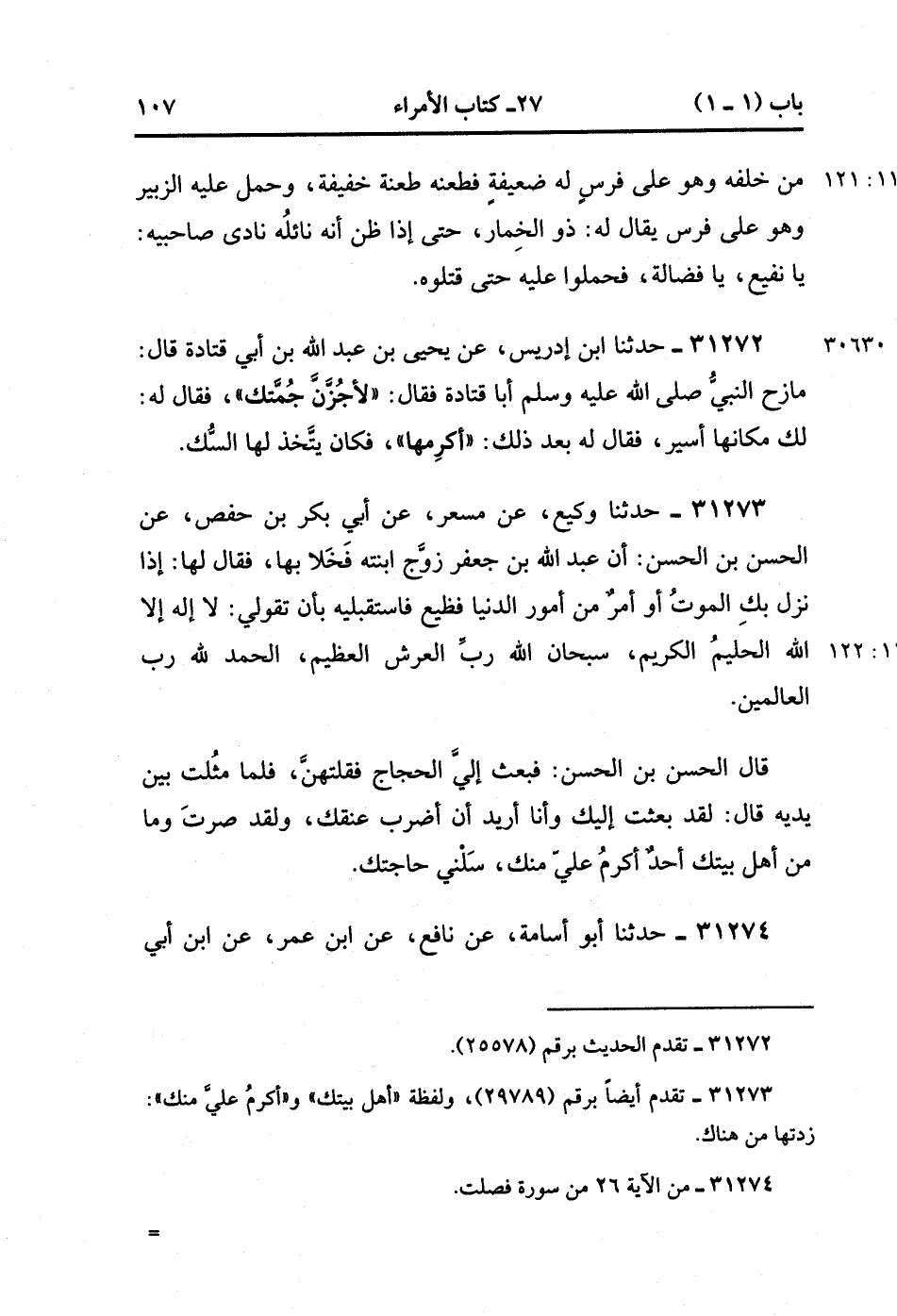 31272- حَدَّثَنَا ابْنُ إدْرِيسَ ، عَنْ يَحْيَى بْنِ عَبْدِ اللهِ بْن أَبِي قَتَادَةَ ، قَالَ : مَازَحَ النَّبِيُّ صَلَّى الله عَلَيْهِ وَسَلَّمَ أَبَا قَتَادَةَ ، فَقَالَ : لاَجُزَّنَّ جُمَّتَكَ ، فَقَالَ لَهُ : لَك مَكَانُهَا أَسِيرٌ ، فَقَالَ لَهُ بَعْدَ ذَلِكَ : أَكْرِمْهَا ، فَكَانَ يَتَّخِذُ لَهَا السُّكَ.