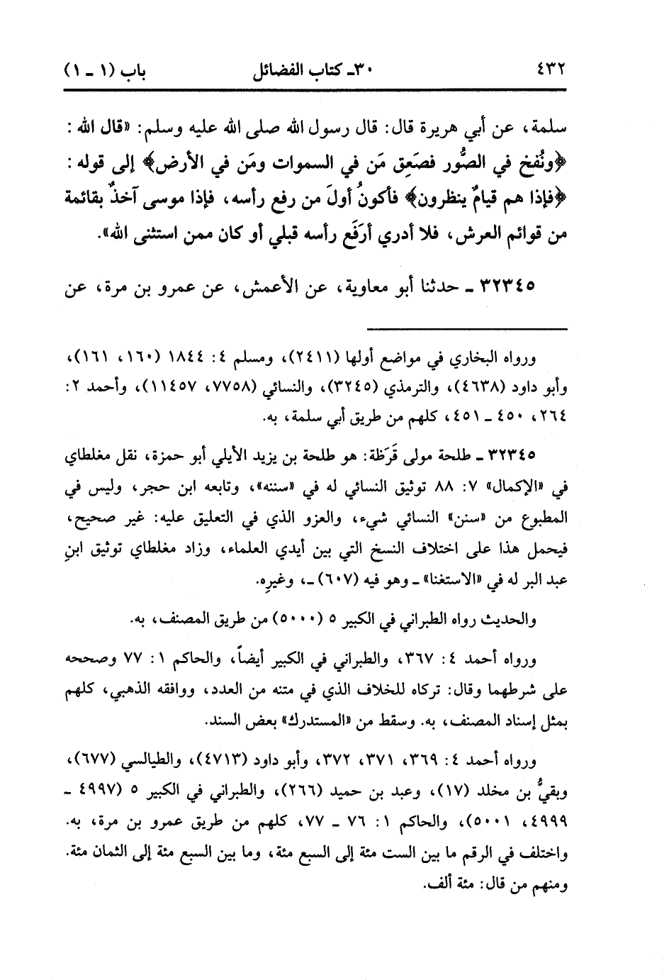 32345- حَدَّثَنَا أَبُو مُعَاوِيَةَ ، عَنِ الأَعْمَشِ ، عَنْ عَمْرِو بْنِ مُرَّةَ ، عَنْ طَلْحَةَ مَوْلَى قَرَظَةَ ، عَنْ زَيْدِ بْنِ أَرْقَمَ ، قَالَ : قَالَ رَسُولُ اللهِ صَلَّى الله عَلَيْهِ وَسَلَّمَ : مَا أَنْتُمْ بِجُزْءٍ مِنْ مِئَةِ أَلْفِ جُزْءٍ مِمَّنْ يَرِدُ عَلِيَّ الْحَوْضَ ، قُلْنَا لِزَيْدٍ : كَمْ كُنْتُمْ يَوْمَئِذٍ ؟ قَالَ : مَا بَيْنَ السِّتِّ مِئَة إِلَى السَّبْعِ مِئَة. (11/455).