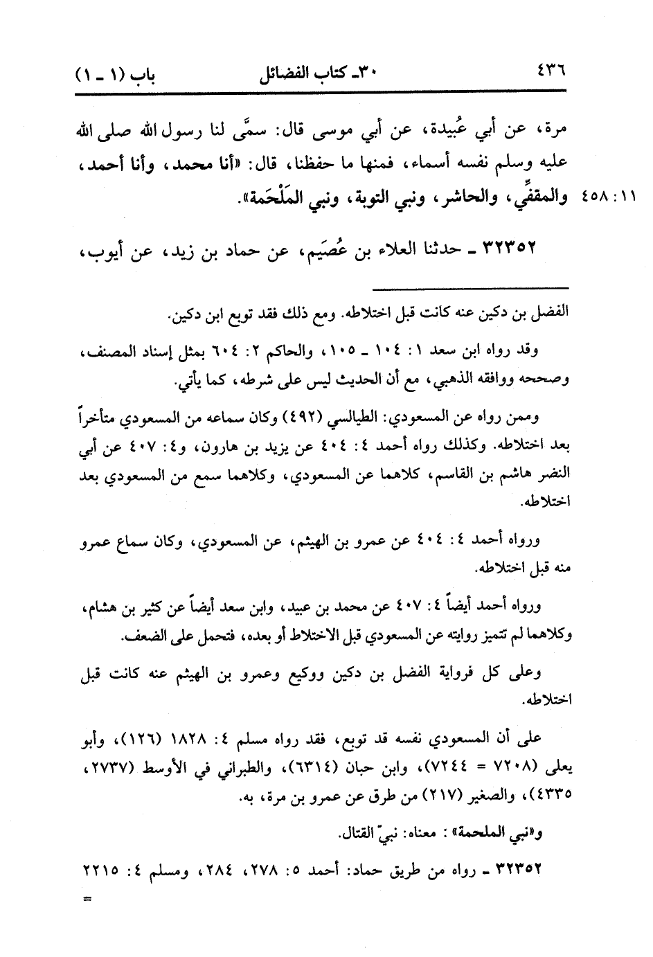 32351- حَدَّثَنَا الْفَضْلُ بْنُ دُكَيْنٍ ، عَنِ الْمَسْعُودِيِّ ، عَنْ عَمْرِو بْنِ مُرَّةَ ، عَنْ أَبِي عُبَيْدَةَ ، عَنْ أَبِي مُوسَى ، قَالَ : سَمَّى لَنَا رَسُولُ اللهِ صَلَّى الله عَلَيْهِ وَسَلَّمَ نَفْسه أَسْمَاءً , فَمِنْهَا مَا حَفِظْنَا ، قَالَ : أَنَا مُحَمَّدٌ ، وَأَنَا أَحْمَدُ ، وَالْمُقَفِّي ، وَالْحَاشِرُ ، وَنَبِيُّ التَّوْبَةِ ، وَنَبِيُّ الْمَلْحَمَةِ. (11/457).