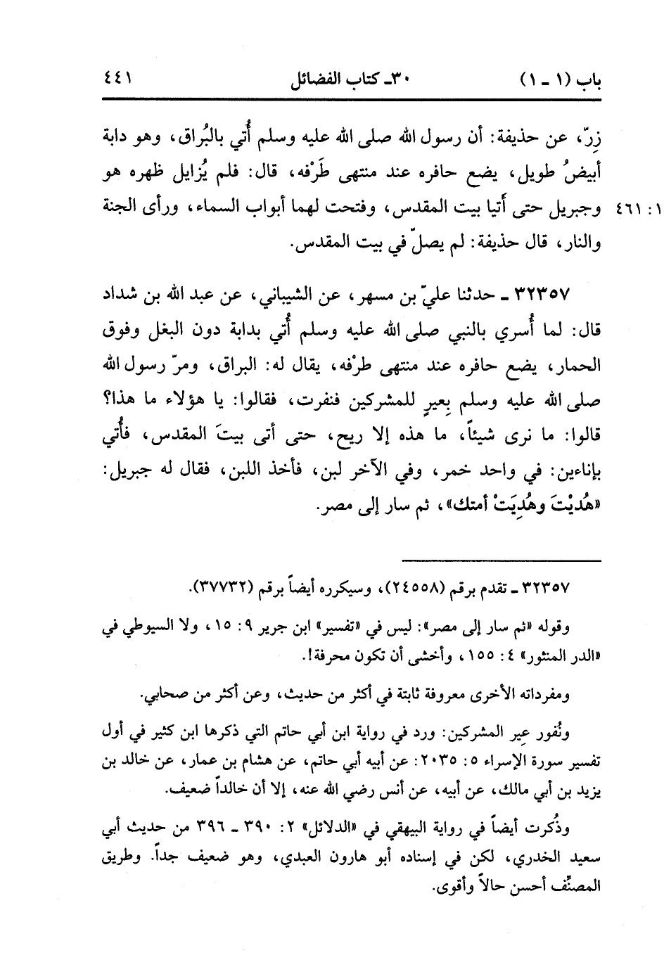 32357- حَدَّثَنَا عَلِيُّ بْنُ مُسْهِرٍ ، عَنِ الشَّيْبَانِيِّ ، عَنْ عَبْدِ اللهِ بْنِ شَدَّادٍ ، قَالَ : لَمَّا أُسْرِيَ بِالنَّبِيِّ صَلَّى الله عَلَيْهِ وَسَلَّمَ أُتِيَ بِدَابَّةٍ دُونَ الْبَغْلِ وَفَوْقَ الْحِمَارِ , يَضَعُ حَافِرَهُ عِنْدَ مُنْتَهَى طَرْفِهِ , يُقَالُ لَهُ : الْبُرَاقُ , وَمَرَّ رَسُولُ اللهِ صَلَّى الله عَلَيْهِ وَسَلَّمَ بِعِيرٍ لِلْمُشْرِكِينَ فَنَفَرَتْ ، فَقَالُوا : يَا هَؤُلاَءِ , مَا هَذَا ؟ قَالُوا : مَا نَرَى شَيْئًا , مَا هَذِهِ إلاَّ رِيحٌ , حَتَّى أَتَى بَيْتَ الْمَقْدِسِ ، فَأُتِيَ بِإِنَاءَيْنِ فِي وَاحِدٍ خَمْرٌ وَفِي الآخَرِ لَبَنٌ , فَأَخَذَ اللَّبَنَ ، فَقَالَ لَهُ جِبْرِيلُ : هُدِيت وَهُدِيَتْ أُمَّتُكَ ، ثُمَّ سَارَ إلَى مِصْرَ. (11/461).