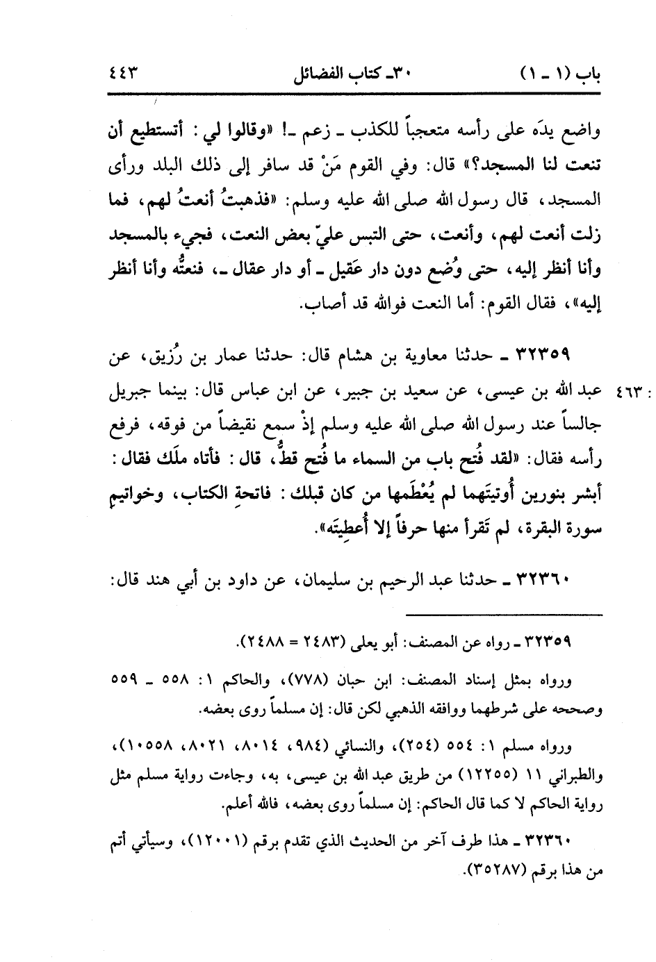 32359- حَدَّثَنَا مُعَاوِيَةُ بْنُ هِشَامٍ , قَالَ : حدَّثَنَا عَمَّارُ بْنُ رُزَيْقٍ ، عَنْ عَبْدِ اللهِ بْنِ عِيسَى ، عَنْ سَعِيدِ بْنِ جُبَيْرٍ ، عَنِ ابْنِ عَبَّاسٍ ، قَالَ : بَيْنَمَا جِبْرِيلُ جَالِسًا عِنْدَ رَسُولِ اللهِ صَلَّى الله عَلَيْهِ وَسَلَّمَ إذْ سَمِعَ نَقِيضًا مِنْ فَوْقِهِ فَرَفَعَ رَأْسَهُ ، فَقَالَ : لَقَدْ فُتِحَ بَابٌ مِنَ السَّمَاءِ مَا فُتِحَ قَطُّ ، قَالَ : فَأَتَاهُ مَلَكٌ ، فَقَالَ : أَبْشِرْ بِنُورَيْنِ أُوتِيتهمَا لَمْ يُعْطَهُمَا مَنْ كَانَ قَبْلَك : فَاتِحَةُ الْكِتَابِ وَخَوَاتِيمُ سُورَةِ الْبَقَرَةِ , لَمْ تَقْرَأْ مِنْهَا حَرْفًا إلاَّ أُعْطِيته. (11/462).
